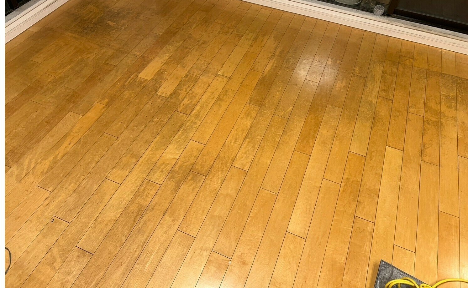 床の表面のワックスが剝がれてしまい、表面にいくつもの傷がついています。