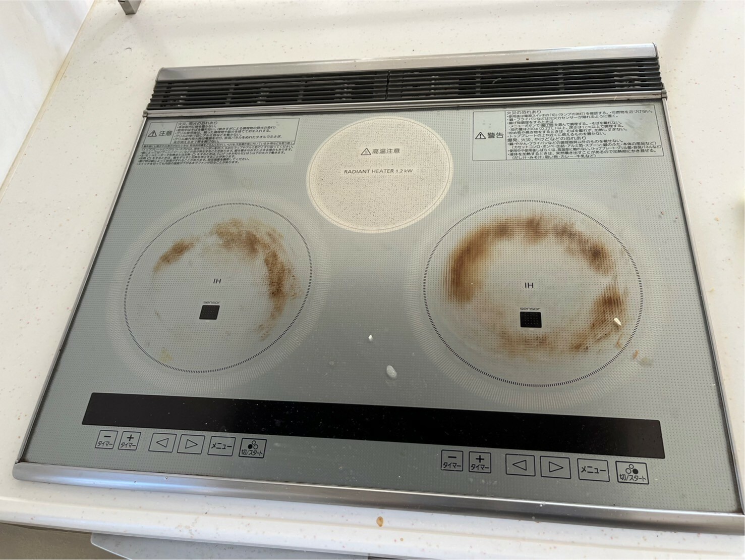 キッチンコンロの掃除をしたことがある方は分かると思いますが、この色の汚れはかなり落としづらいんです。。