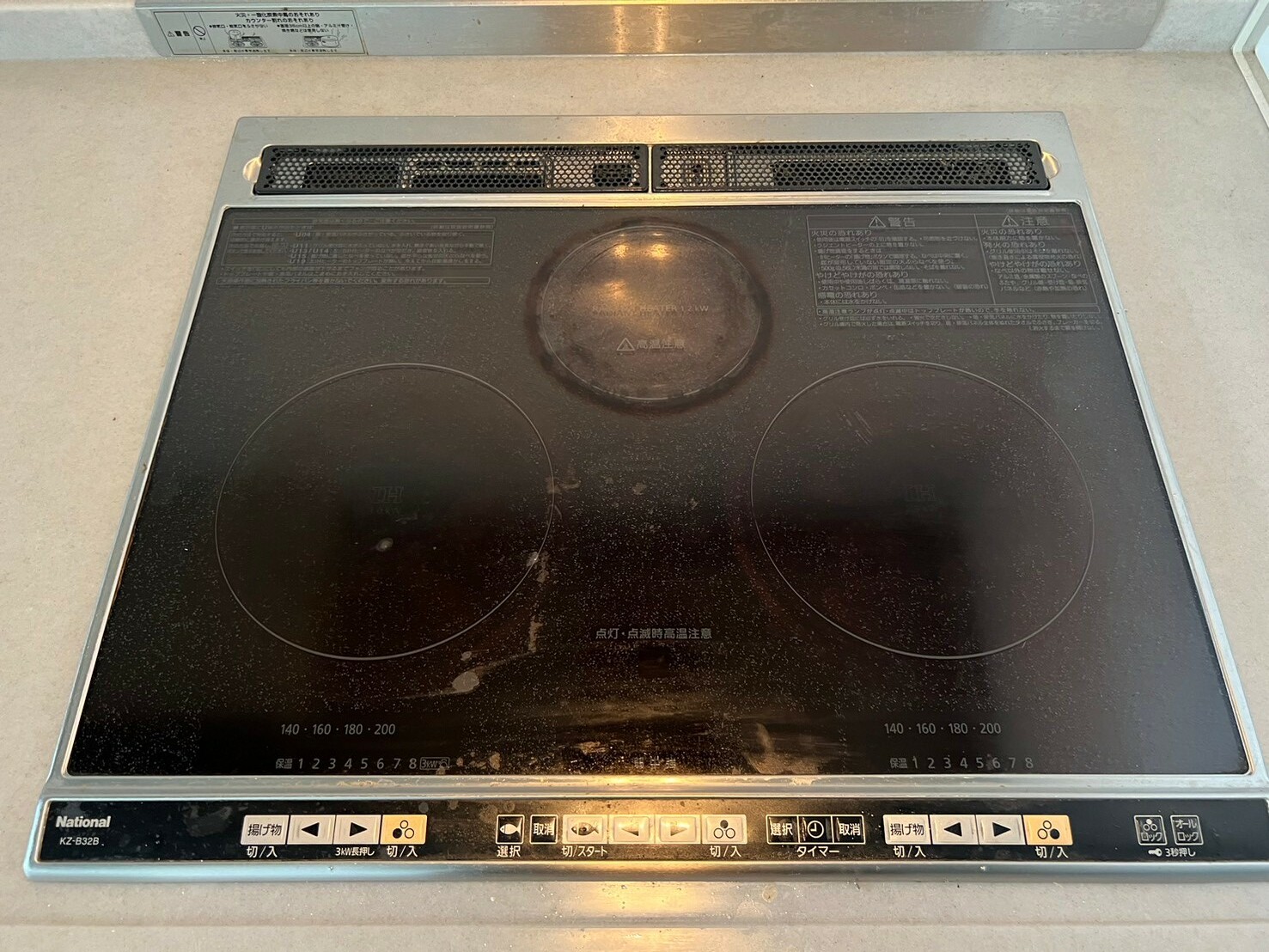 キッチンコンロの全体に汚れが散っていて、 五徳や五徳の下の部分にも汚れが溜まってしまっています。