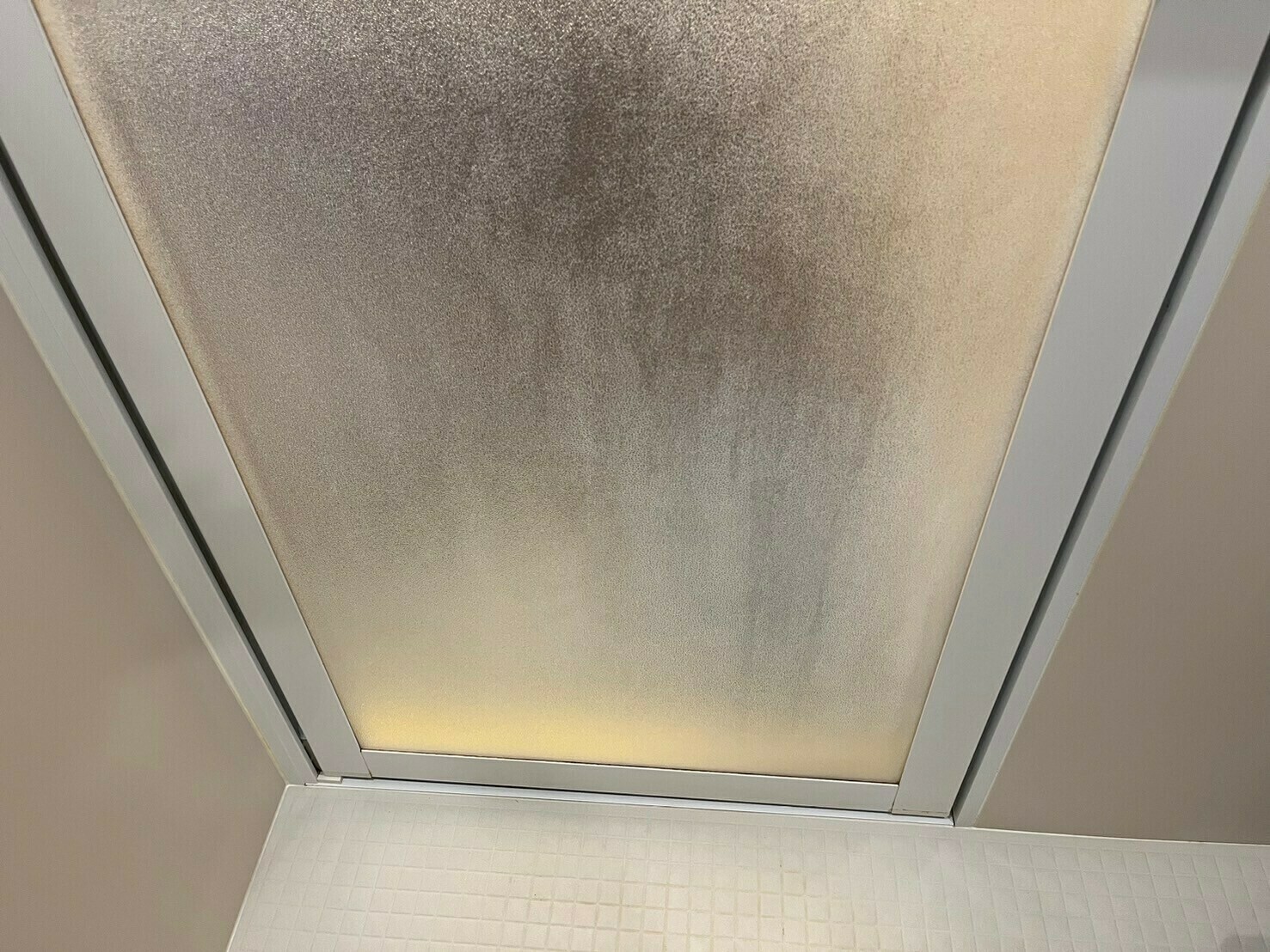 浴室の扉は石鹼カス汚れで汚れていますね😨