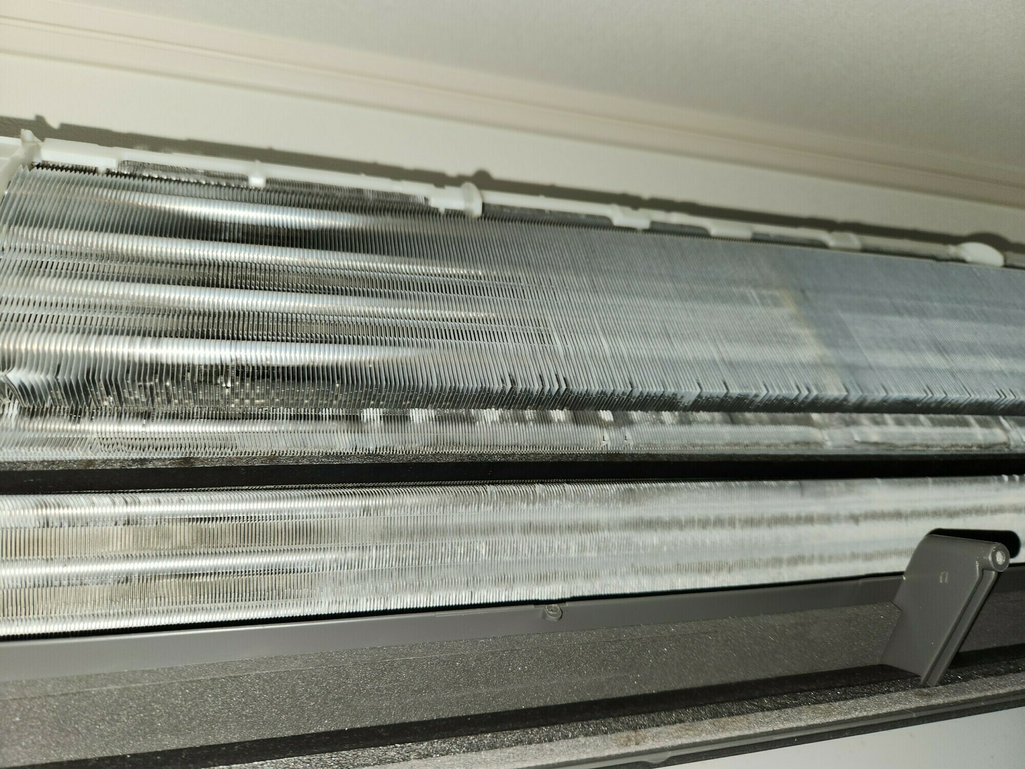 エアコンのアルミフィンには埃が埋まっていますね💦