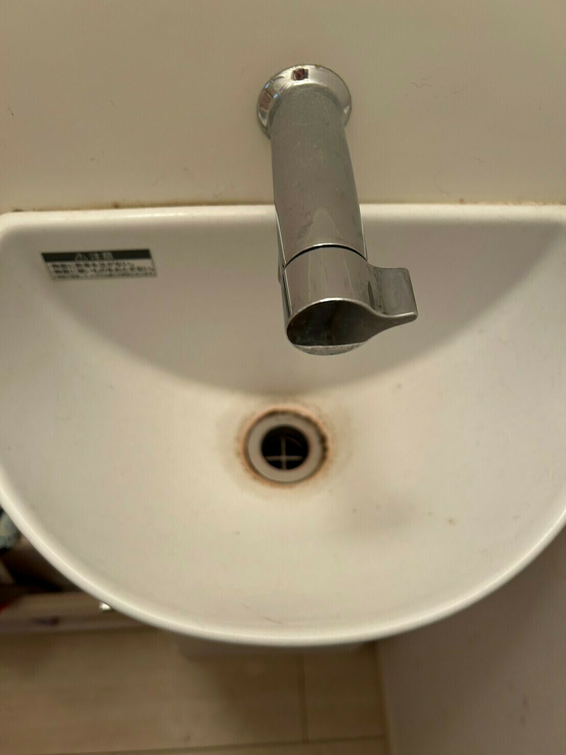 カルキ汚れが蛇口周りに、排水口付近には石鹼カス汚れがついていますね😱