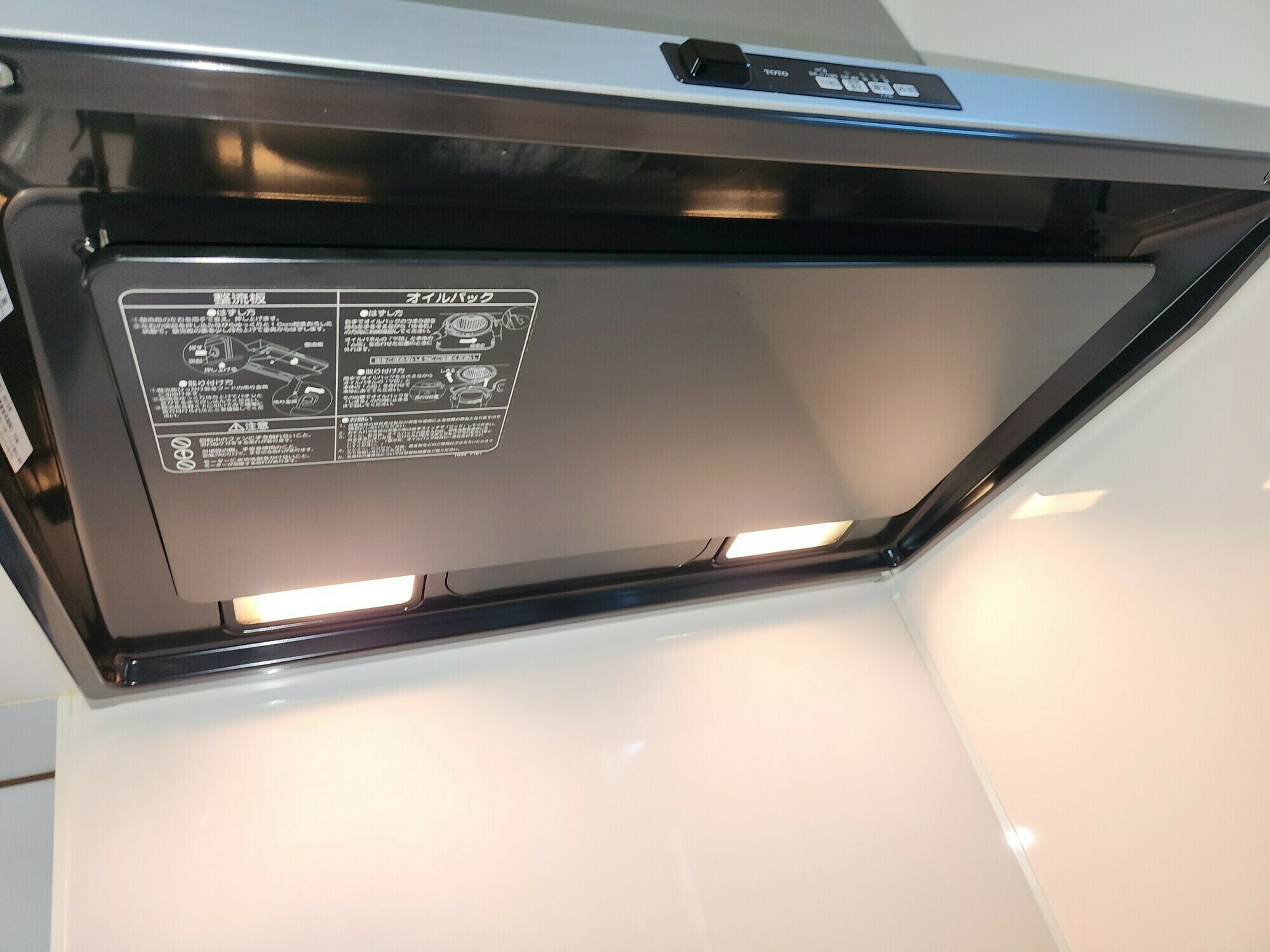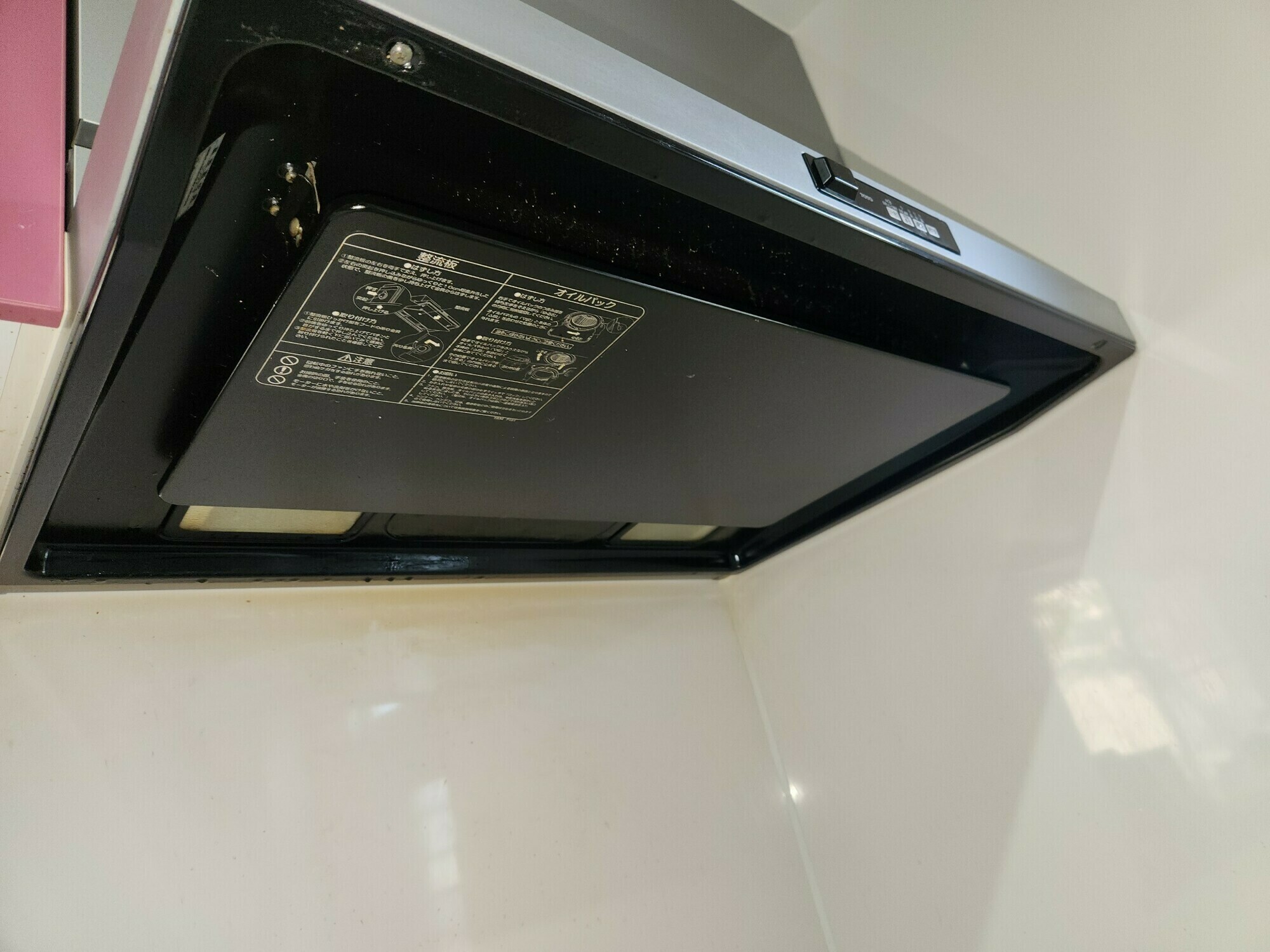 レンジフード周りですが、油汚れはついていて色が黄色っぽくなっています😱レンジフードの壁との境目にも油汚れがついていますね💦