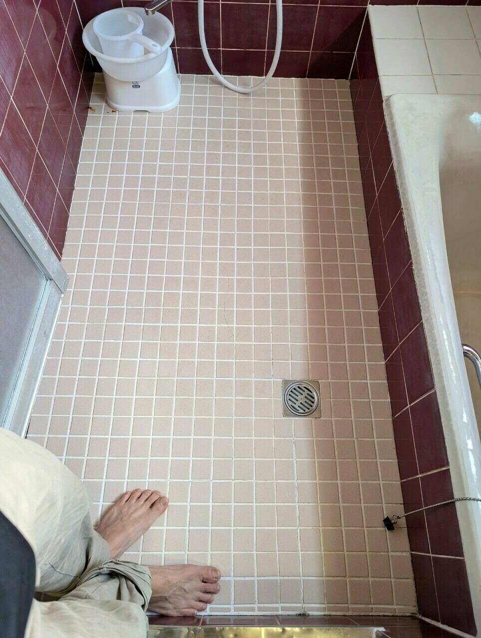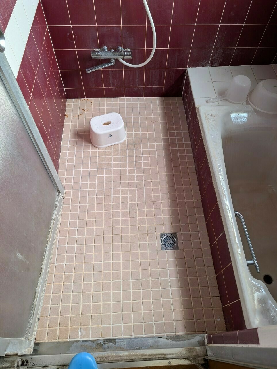 タイルの目地や扉・壁などに石鹼カス汚れや皮脂汚れ、カルキ汚れが全体的に目立っていますね💦