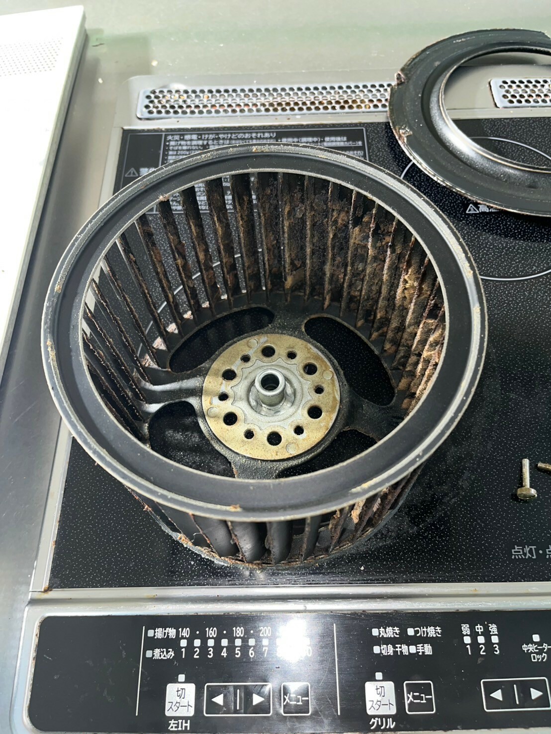 普段目に見える部分や、換気扇の内側も含めて、かなり油汚れが付着して溜まっているのが分かると思います。
