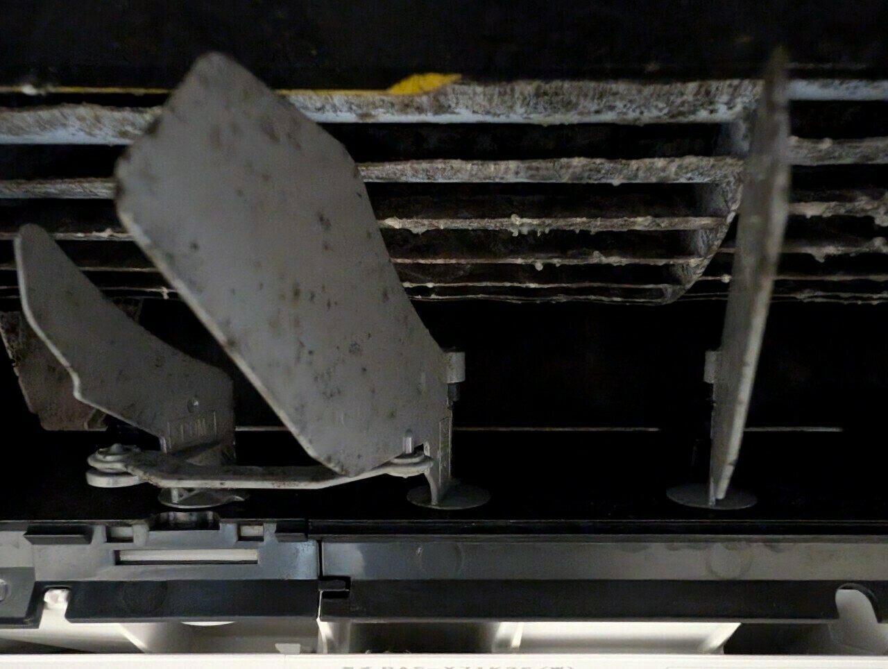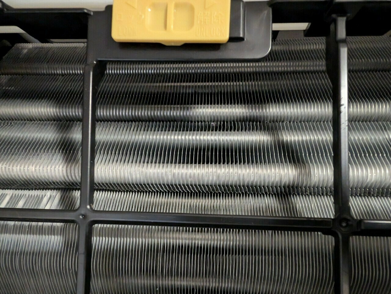 エアコンのアルミフィンは、真ん中あたりが黒カビ汚れが発生していますね💦