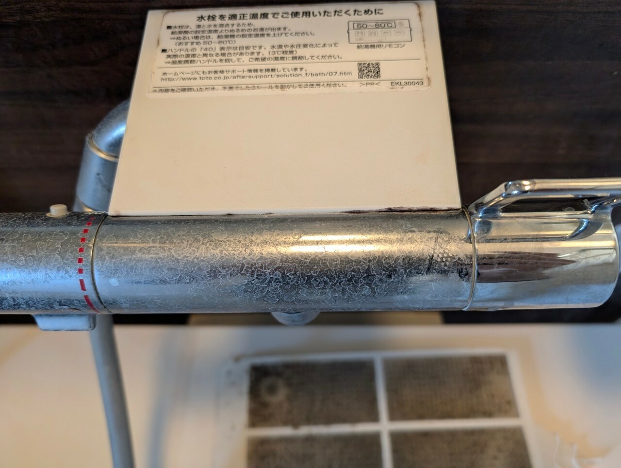 浴室のリモコンやシャワーにも、よく見ると水垢がついているんですよね。。