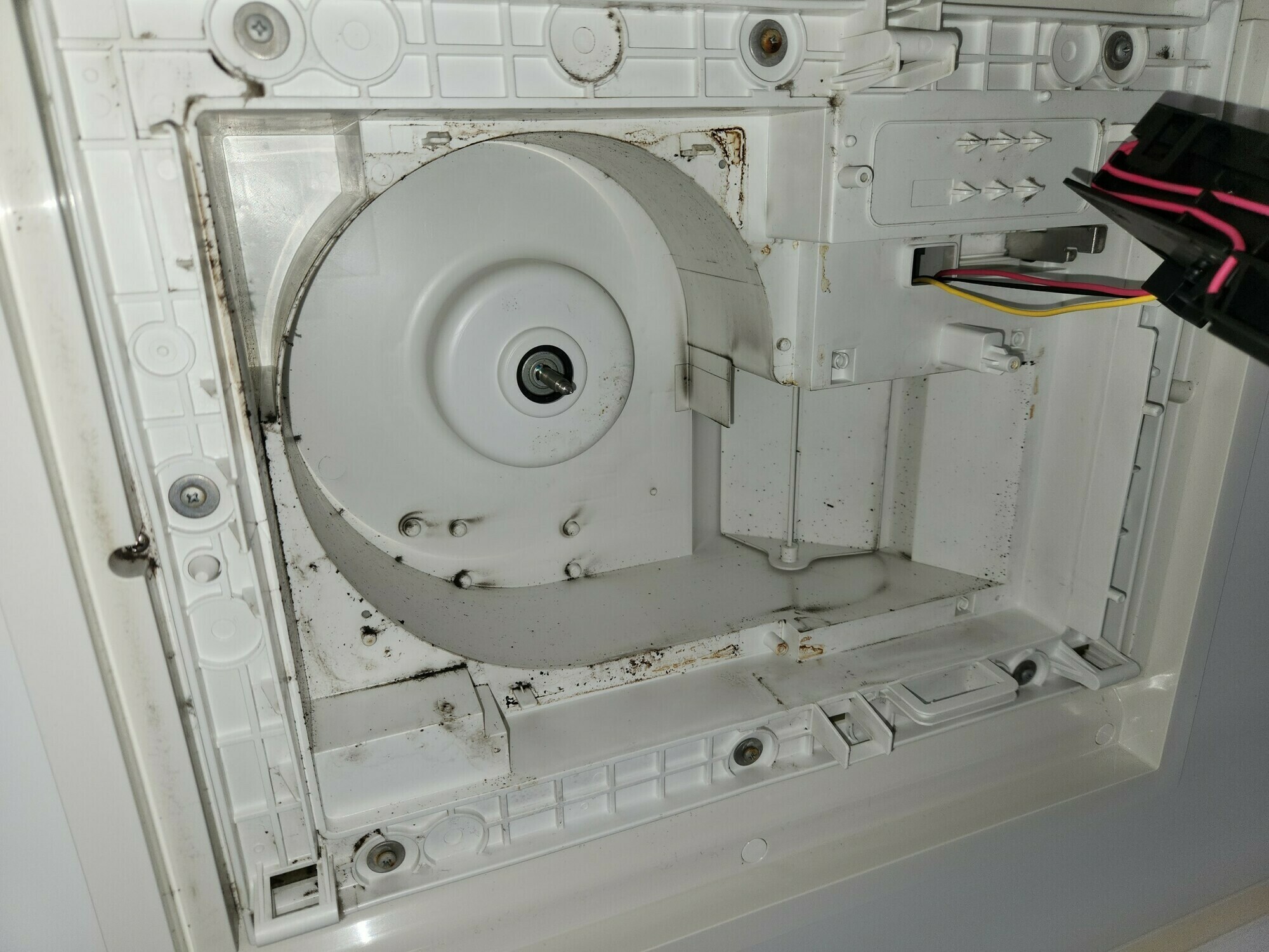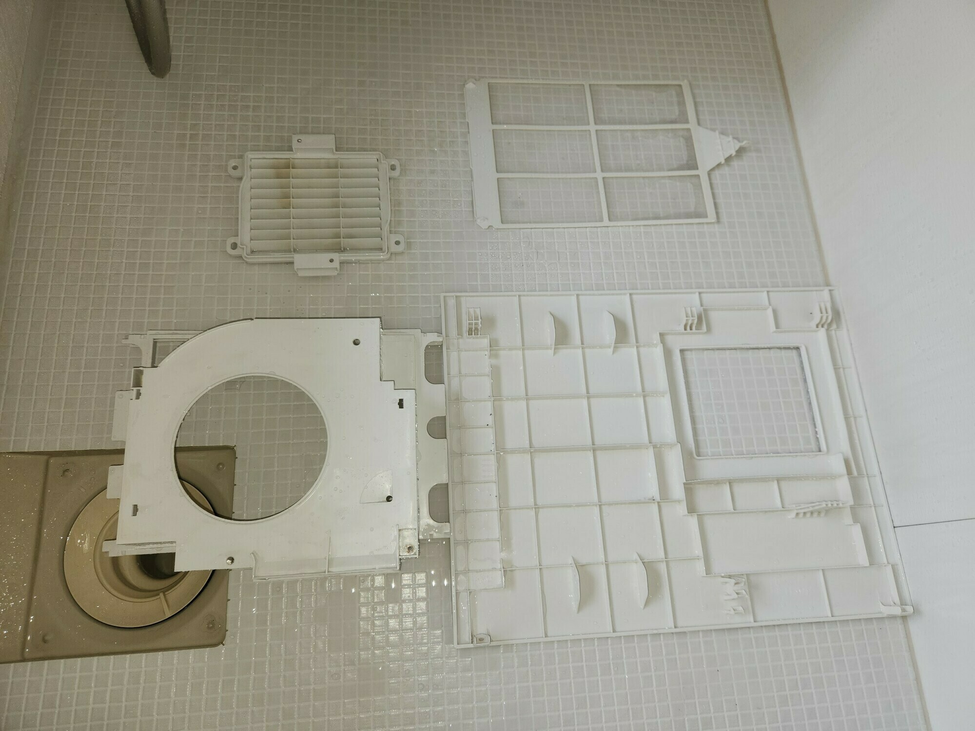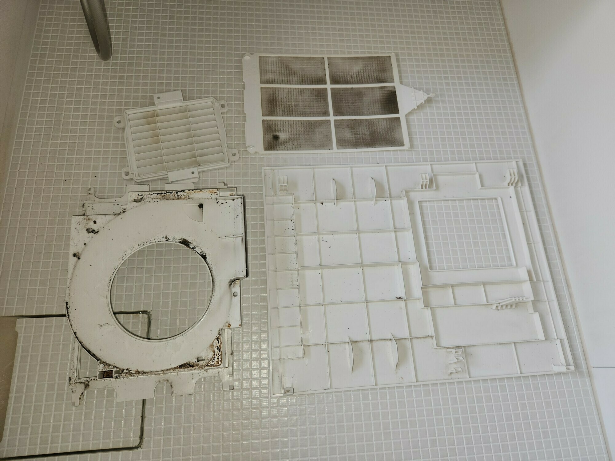 浴室換気扇のフィルターや各パーツにも黒カビ汚れがたくさんついていますね😱