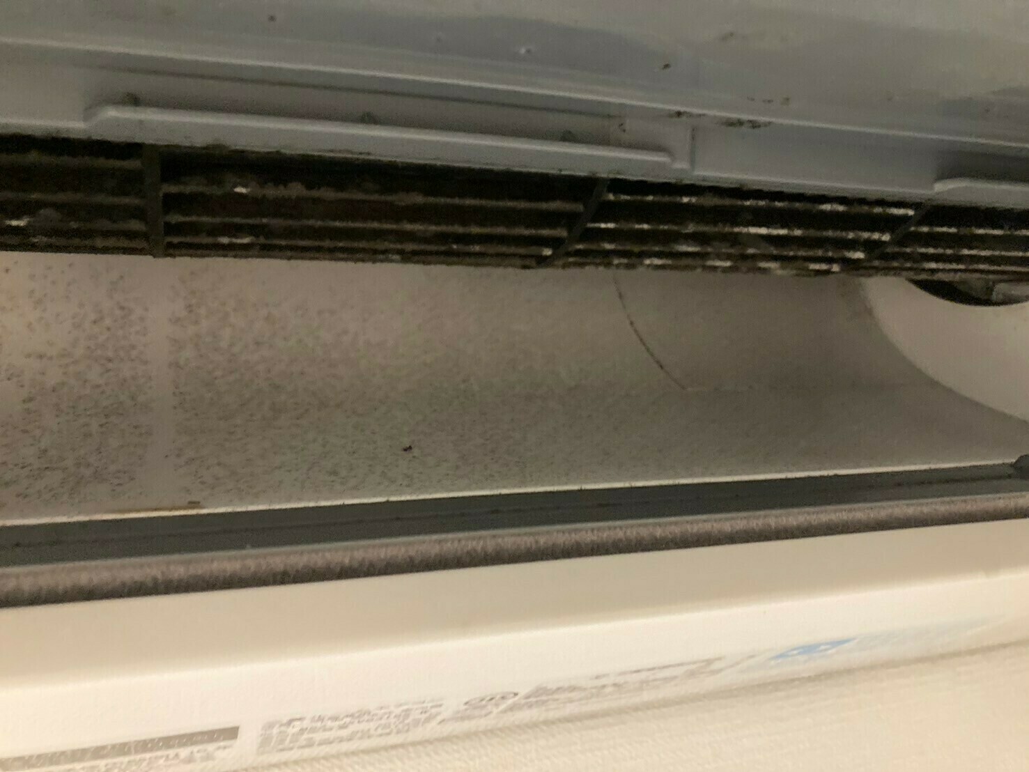 送風ファンには埃と黒カビ汚れが…送風口も薄っすらですが、黒カビ汚れがついています💦