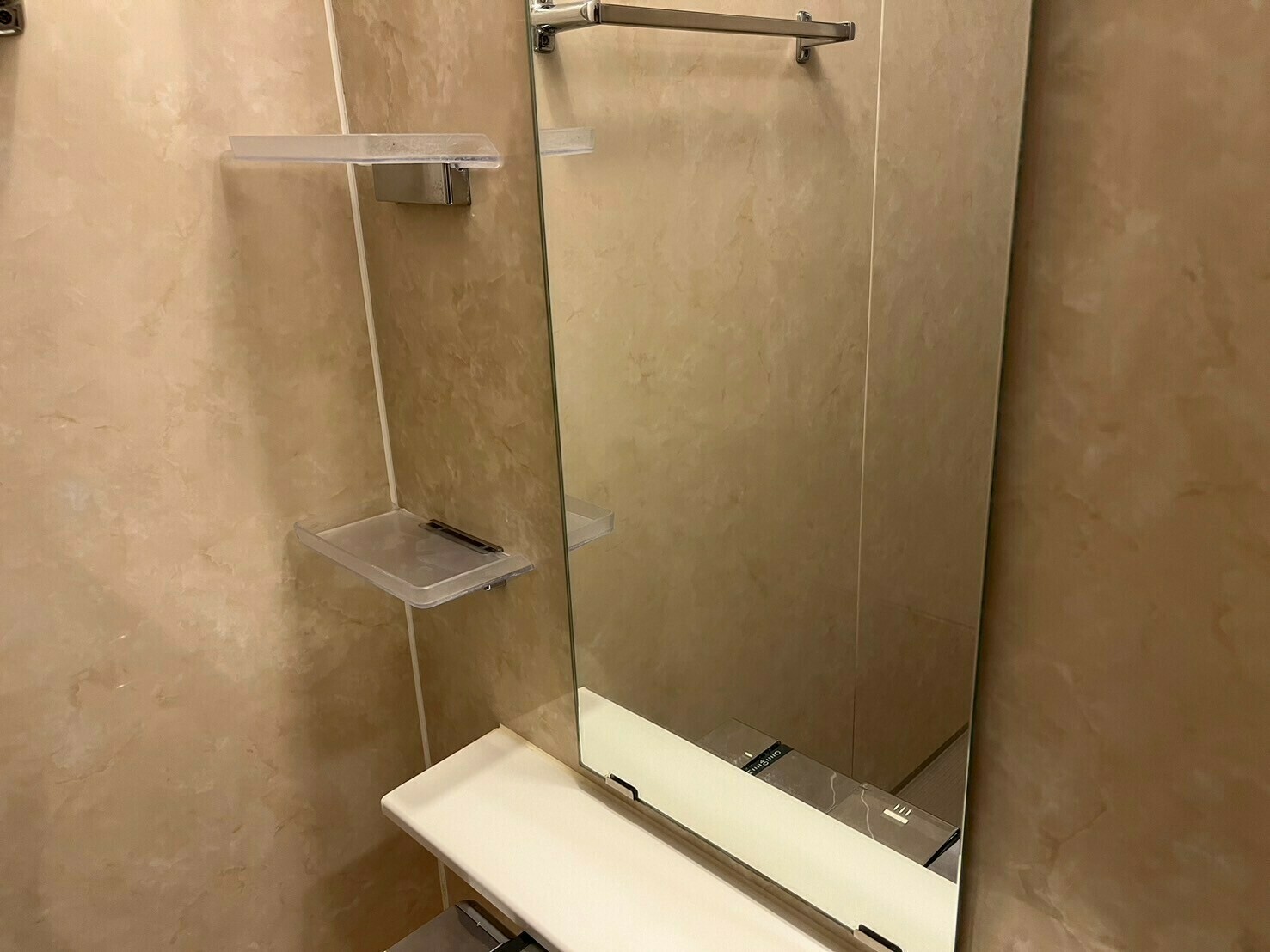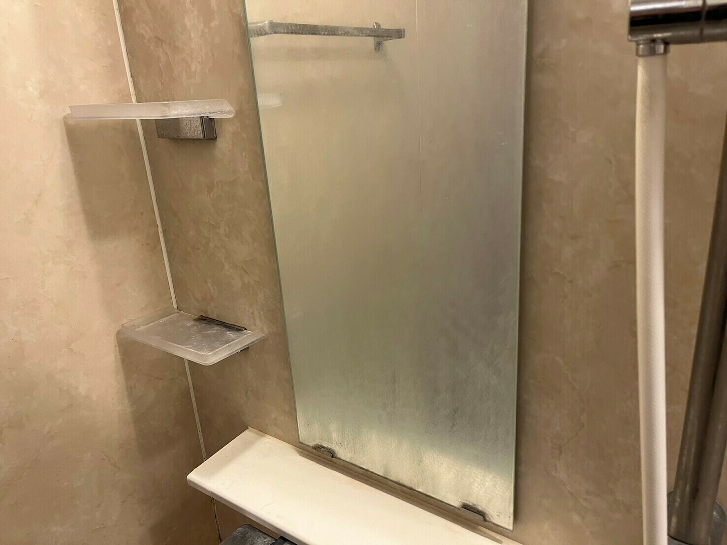 収納化粧板も、シャンプー等の小物を置いていた跡が残っています💦