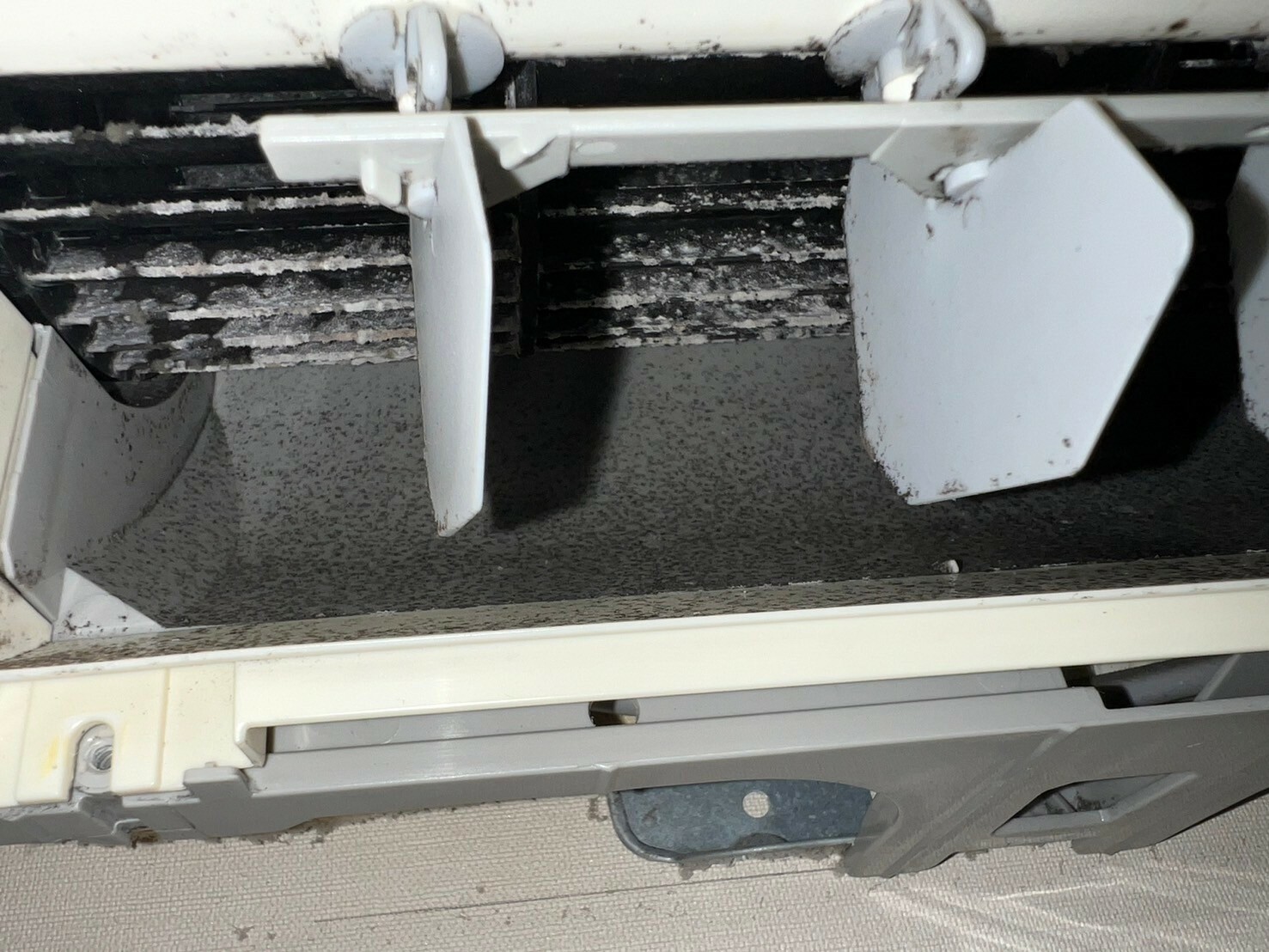 エアコンの吹き出し口を覗いてみると、このような形で汚れが溜まっています。
