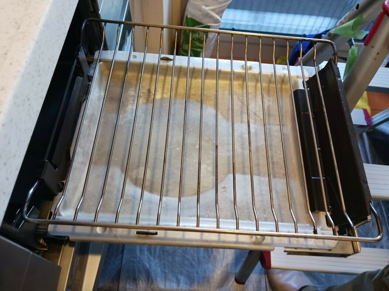網と受け皿には魚を焼いた後の油汚れがついています💦