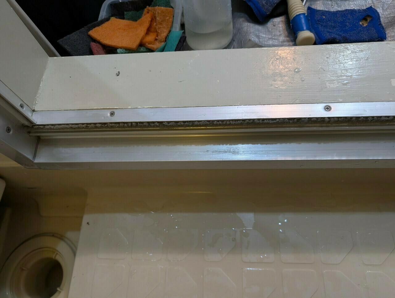 浴室の扉のサンのフェルト部分は、石鹼カス汚れや皮脂汚れで色が変色していますね💦