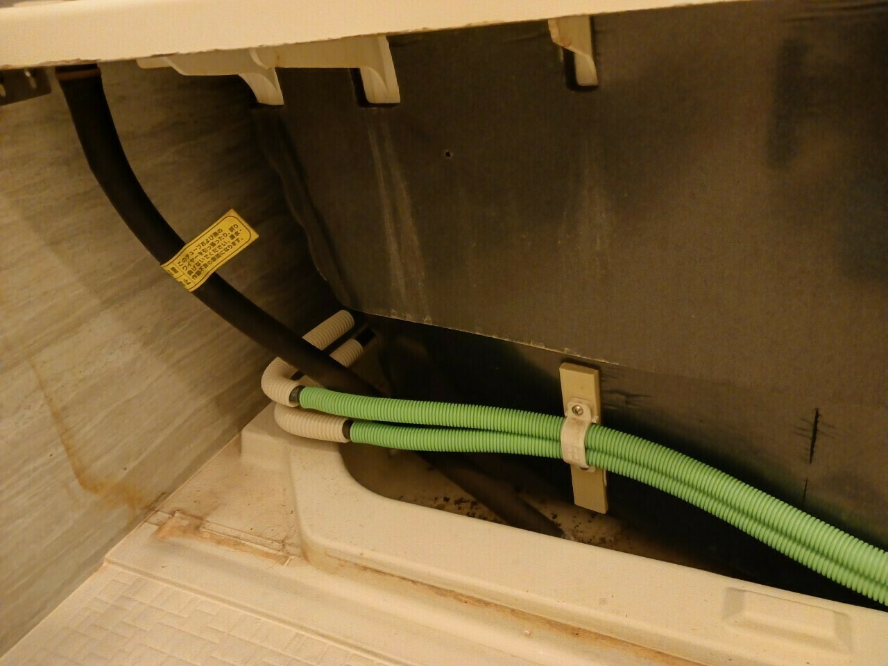 浴槽のエプロンを外すと、黒カビ汚れや皮脂汚れ等が蓄積していますね😂