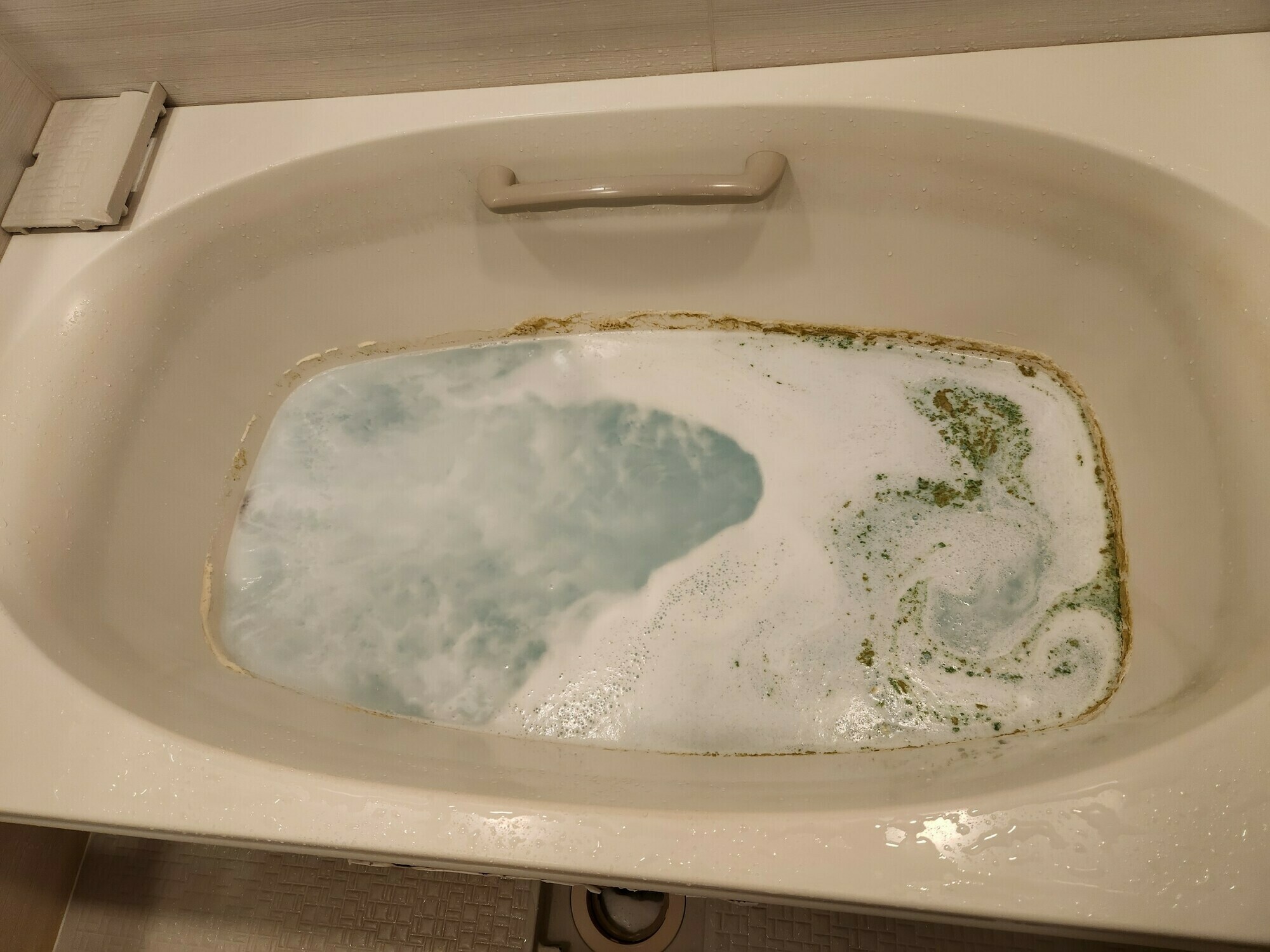 少し時間をおき、バスタブ内の汚水の変化があまり見られなくなり、汚れが完全に湧き出てこなくなったのを確認してから、バスタブ内に溜まった汚れとさよならします。