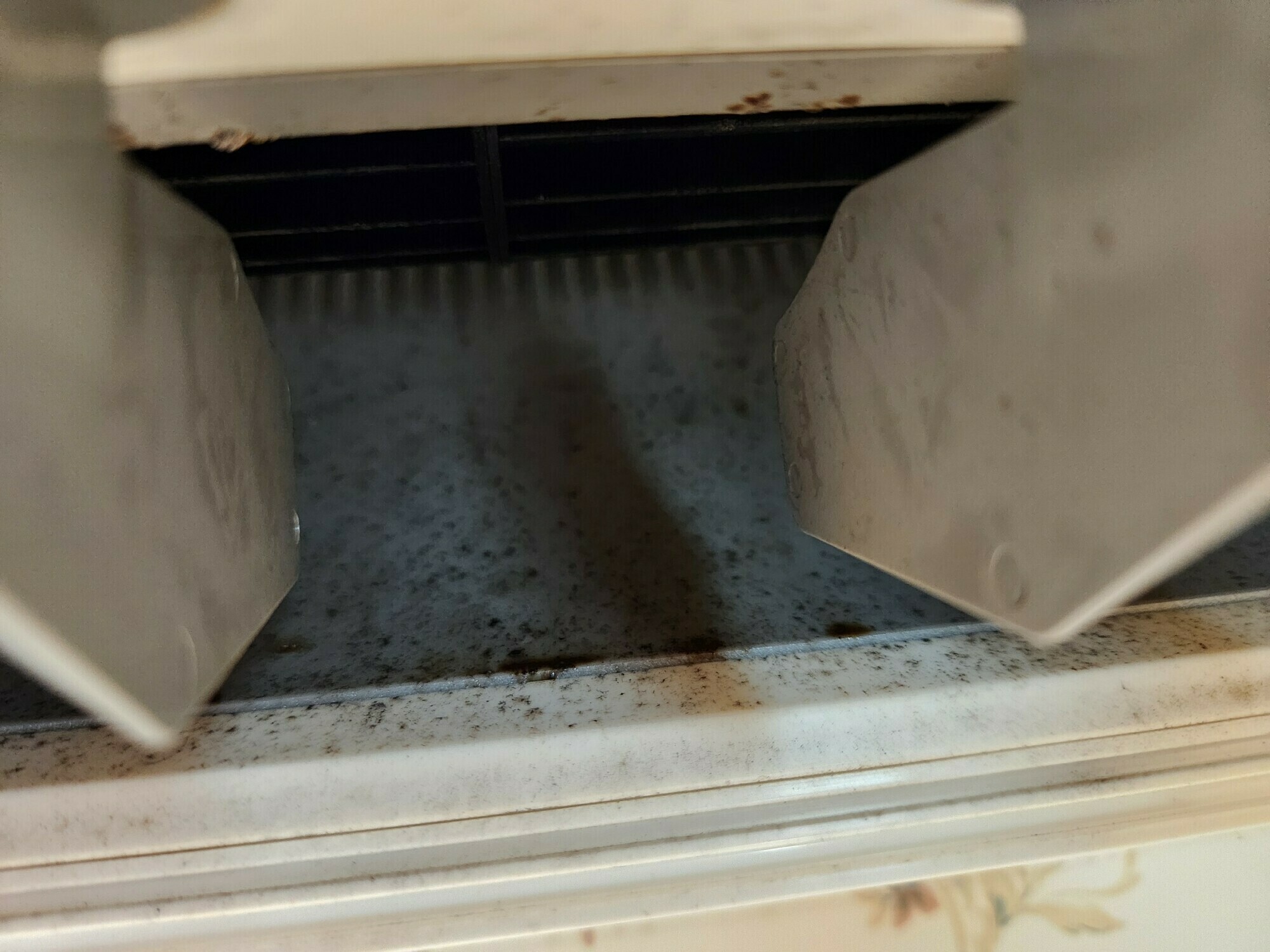 風向板に少し黒カビがついていますが、送風ファンにはカビの上に埃が乗っています😵💫