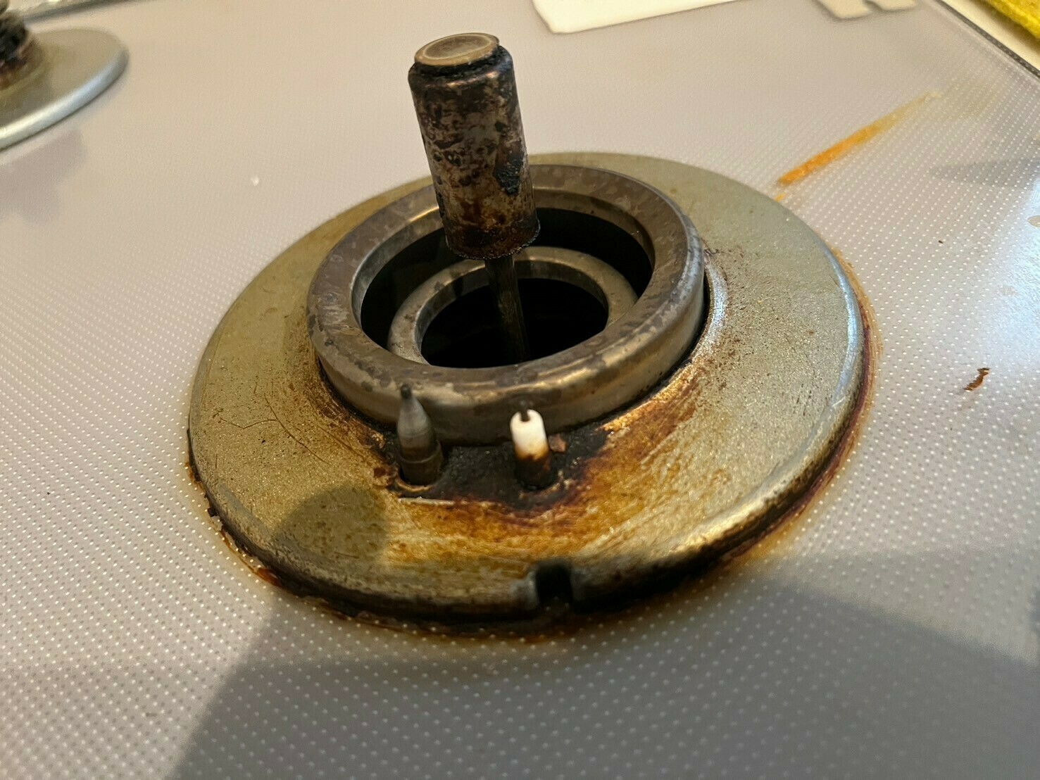 サムネイル写真にあったガスコンロのうちの1つです。バーナー部分とバーナーリングには油汚れと焦げがついています😐