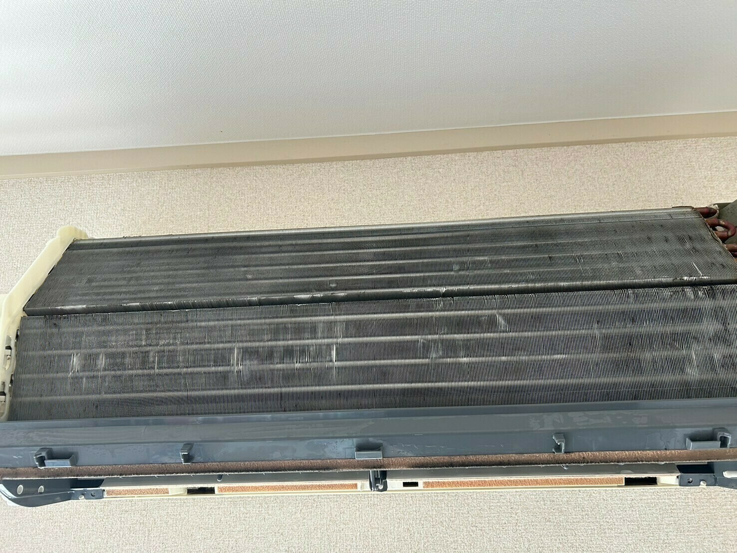 サムネイル画像にもあったこちらのエアコンの内部ですが、アルミフィンに埃がびーっしり埋まっていますね💦