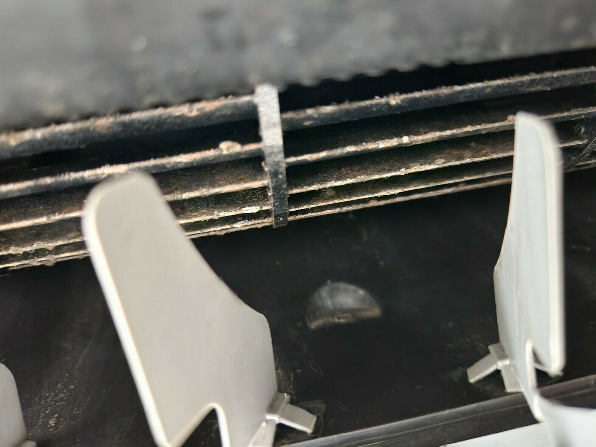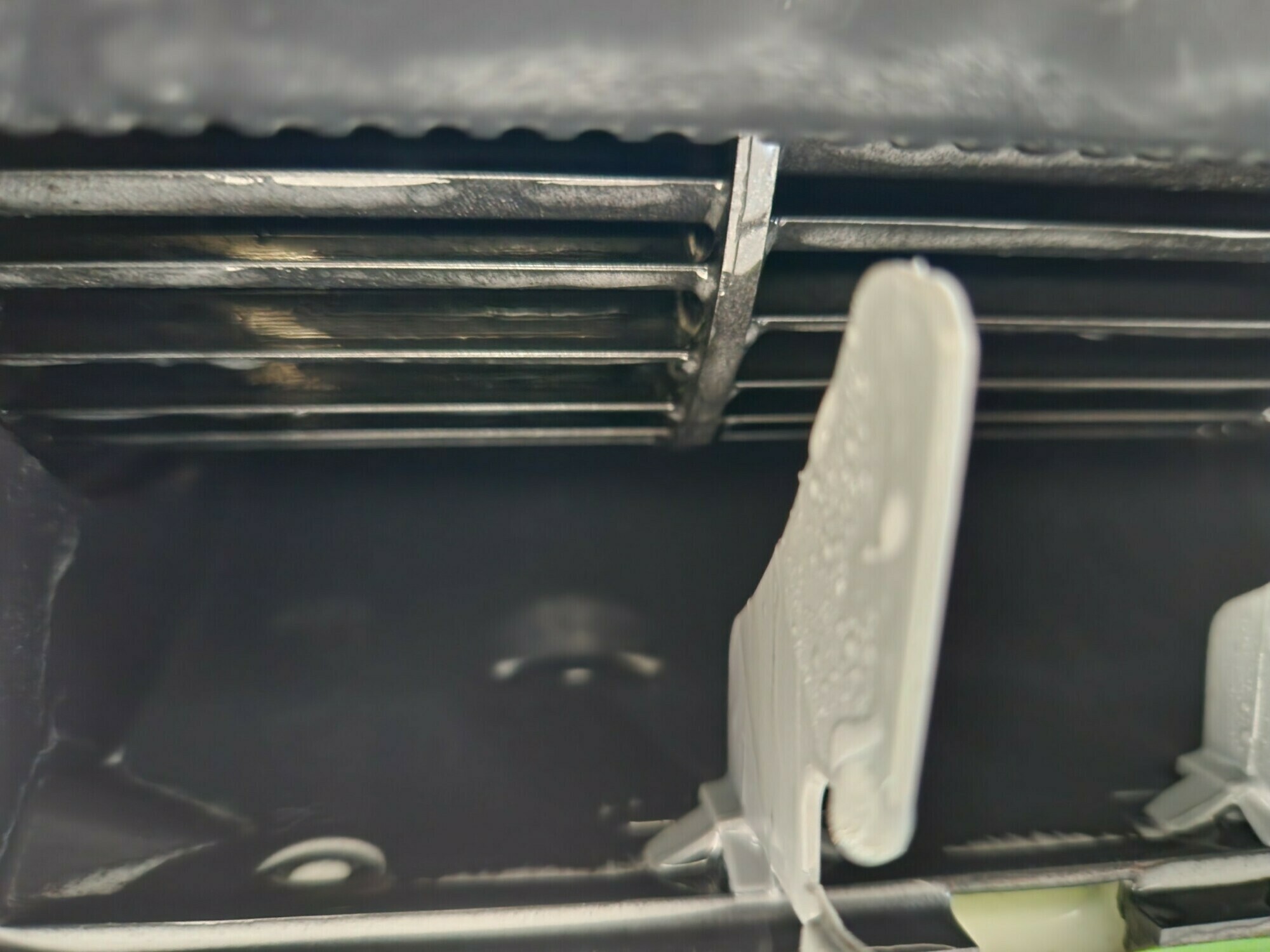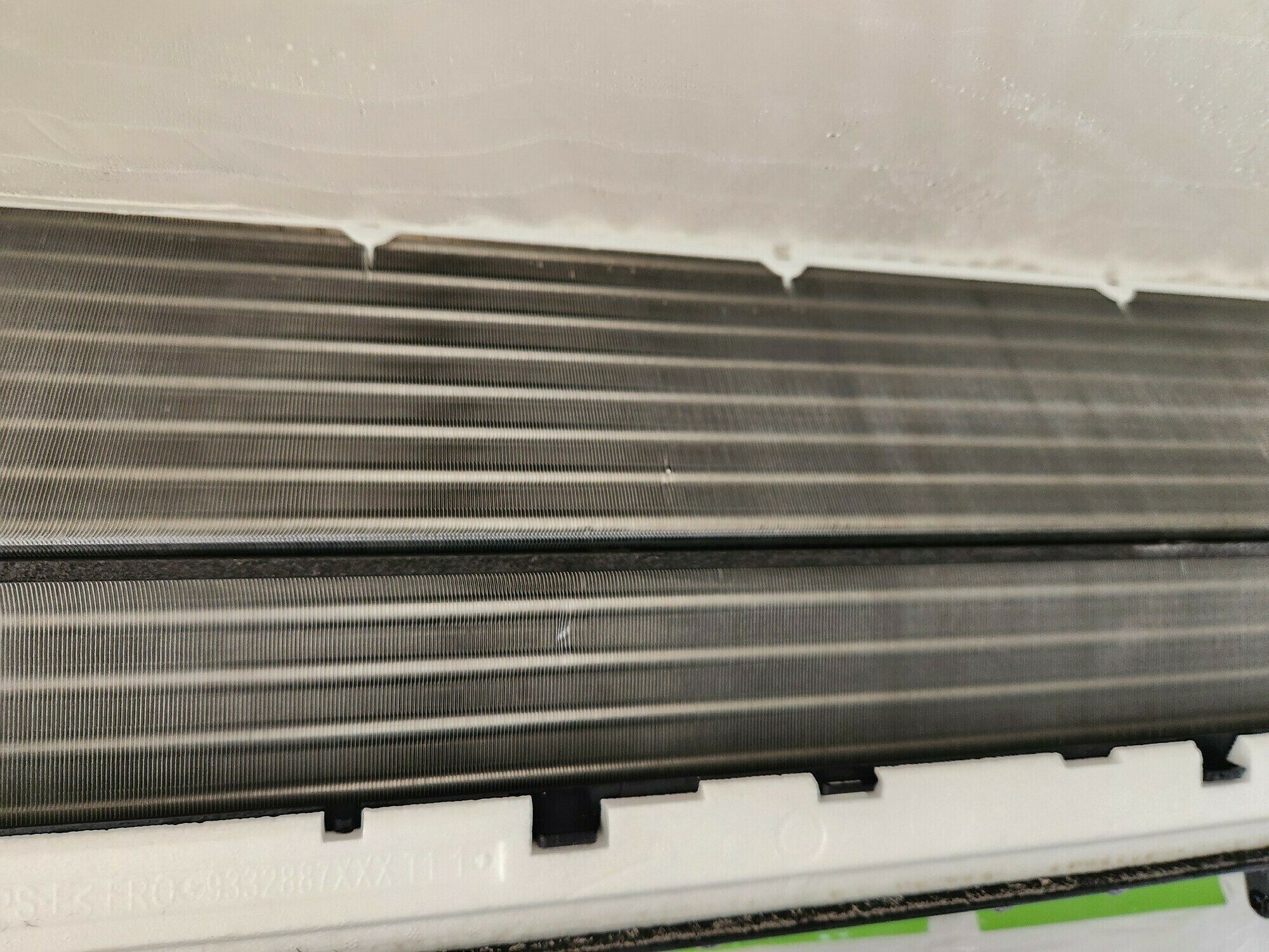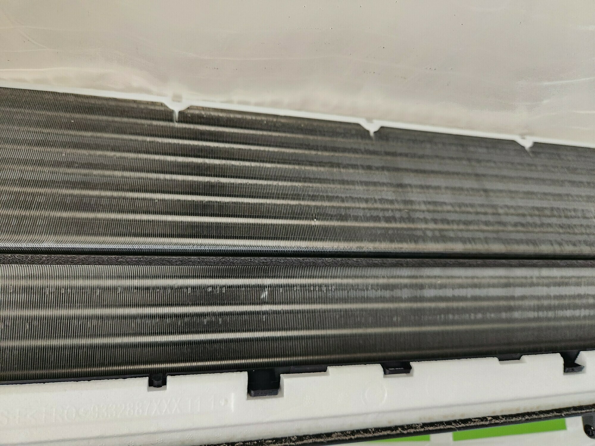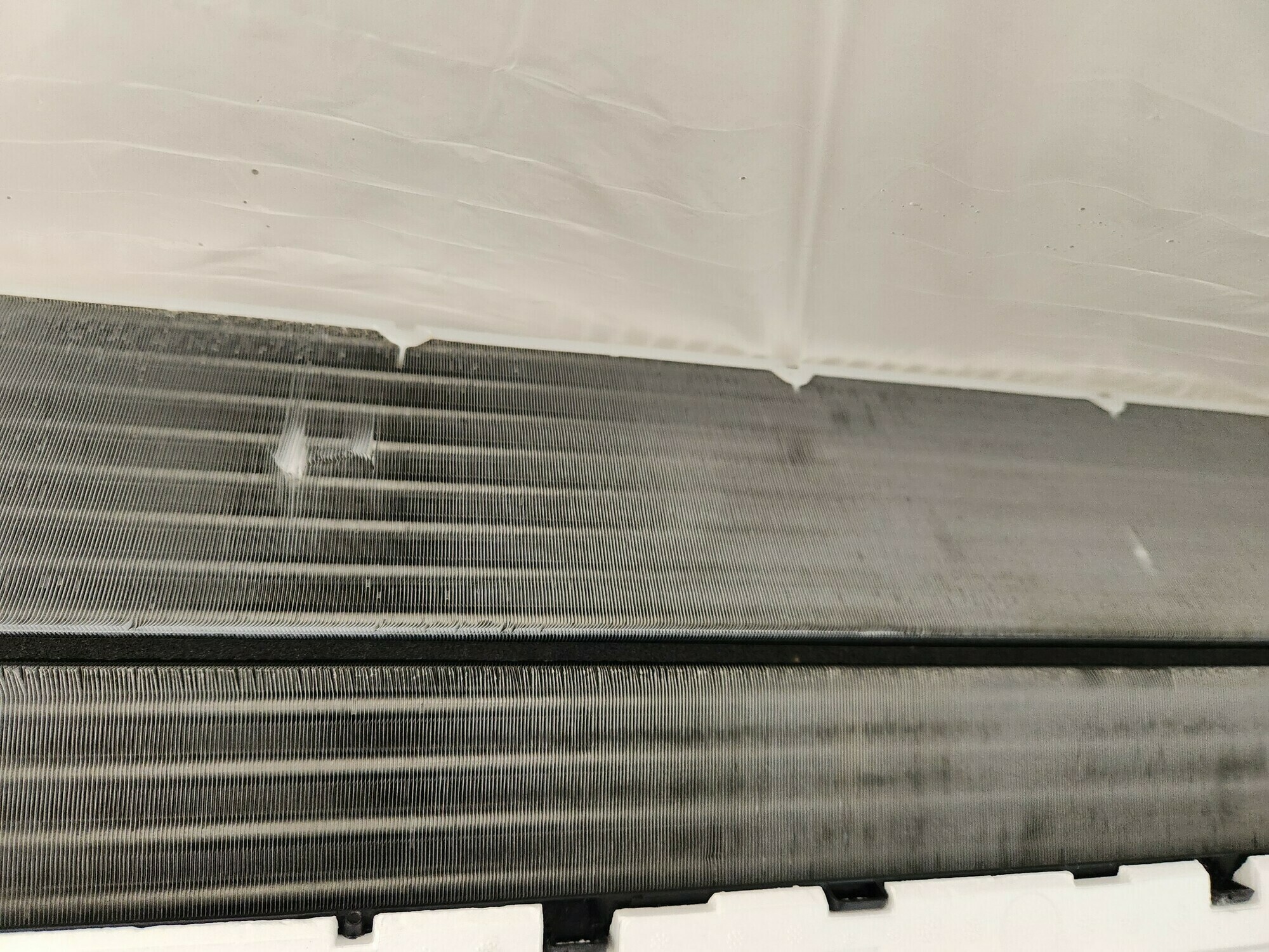 サムネイル画像にもあったエアコンの内部ですが、アルミフィンの左の上側を見ていただくと埃が埋まっていることが分かります💦