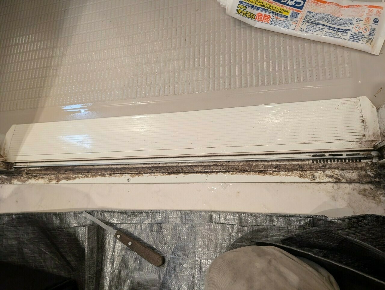 サムネイル画像にもあったこちらの浴室と脱衣所の境目の扉のレールには、石鹼カス汚れや皮脂汚れが蓄積し、黒カビが大量に発生しています💦
