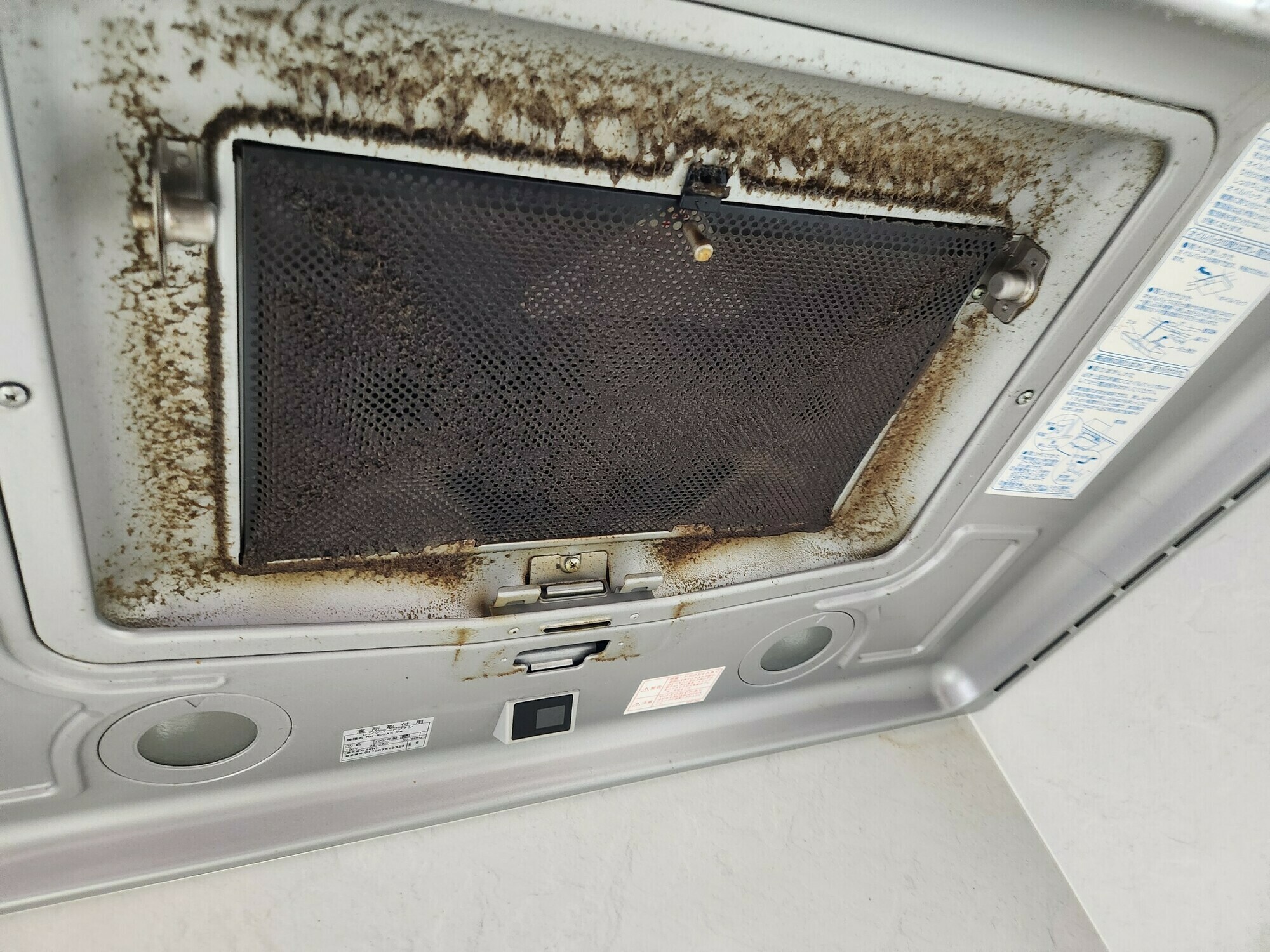 サムネイル画像にもあったこちらのレンジフード内は頑固な油汚れと埃がびっしりついていますね😨