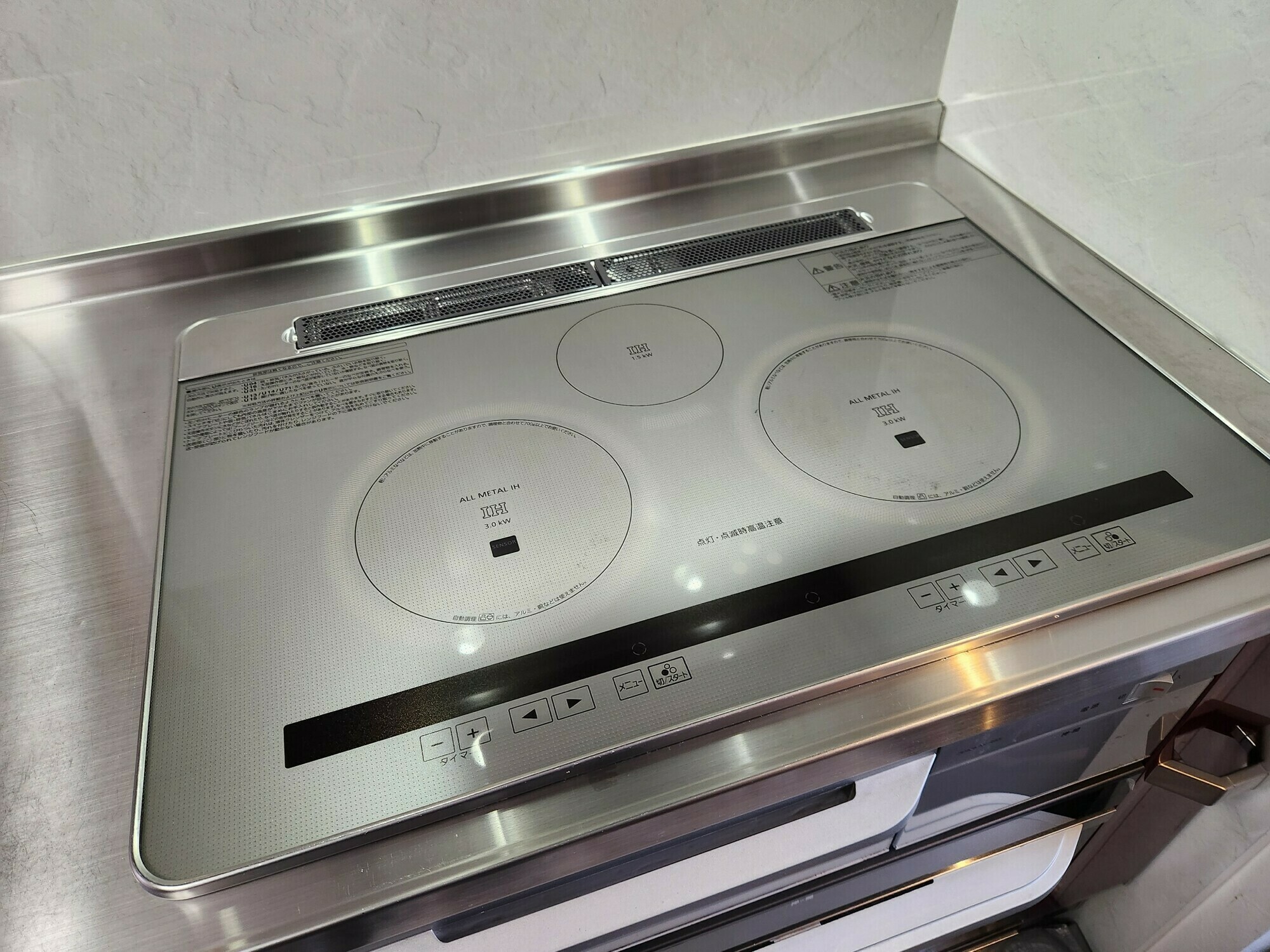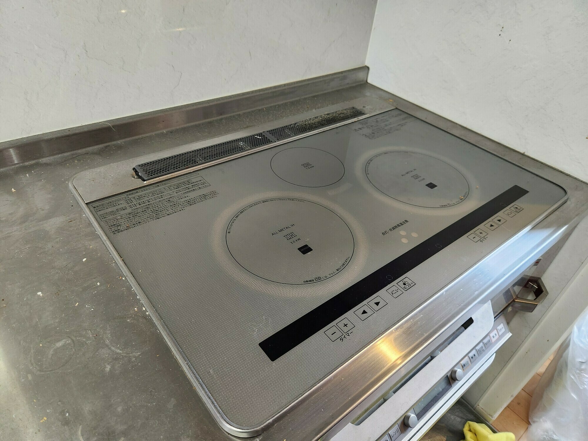 IHコンロは焦げなどなく綺麗ですが、コンロ周りには油跳ね汚れや物を置いていた跡などがついています💦
