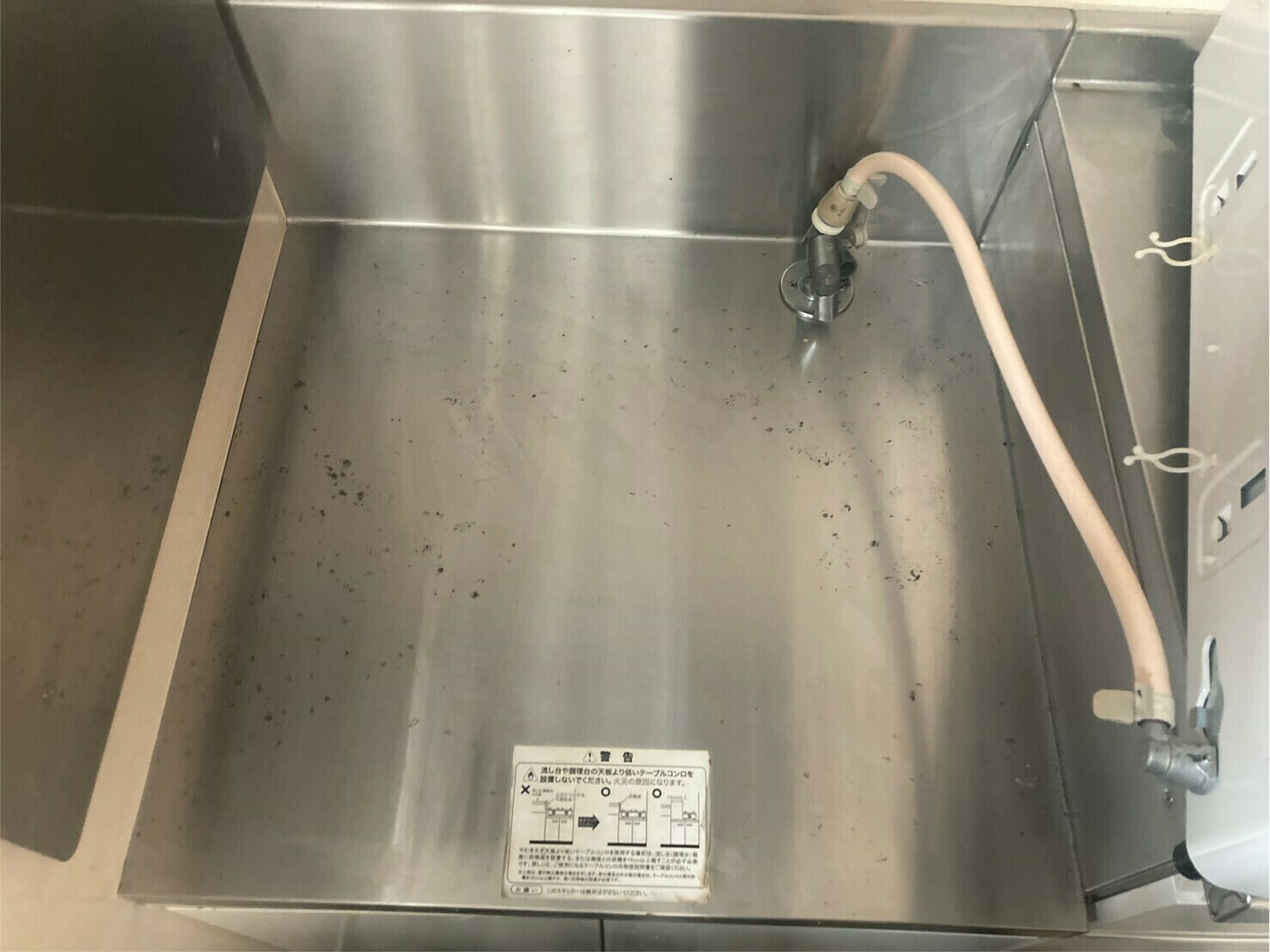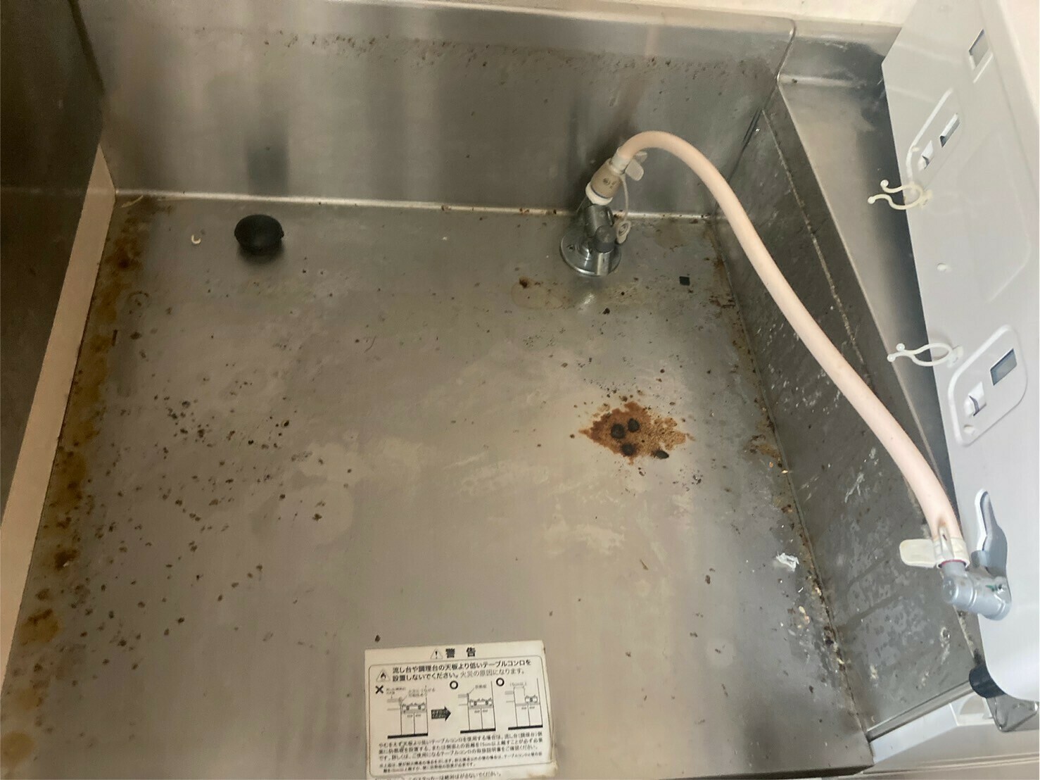 ガスコンロを置いていたシステムキッチンです。ガスコンロの下も汚れがたくさんありますね💦