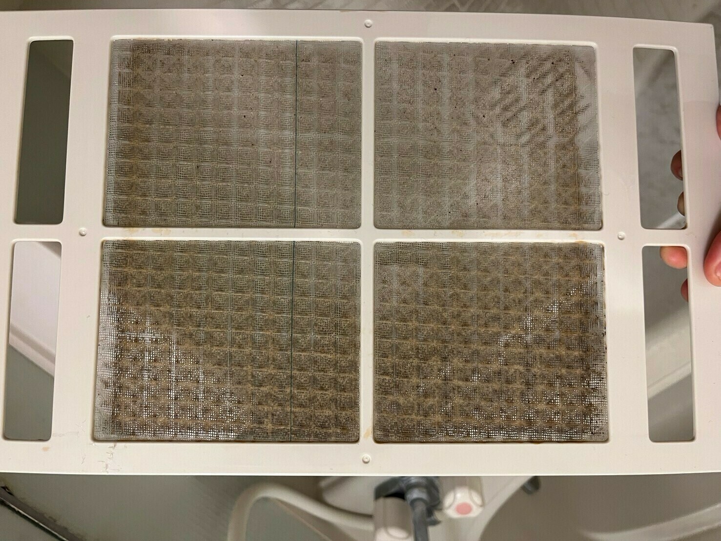 浴室の換気扇のフィルターには埃と黒カビがびっしり埋まっていますね😨