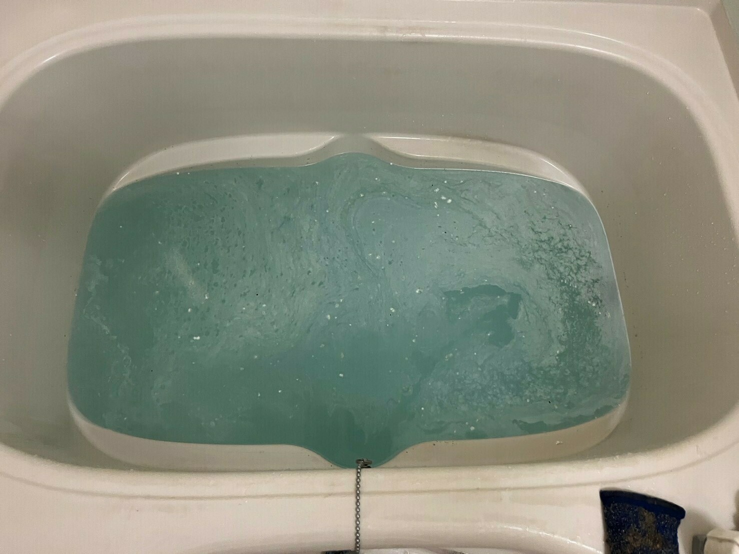②少しずつ色が変わり、汚れが浮き終わった5分後、風呂釜配管の本格的に汚れをとる為に浴槽に発泡剤を入れました😊