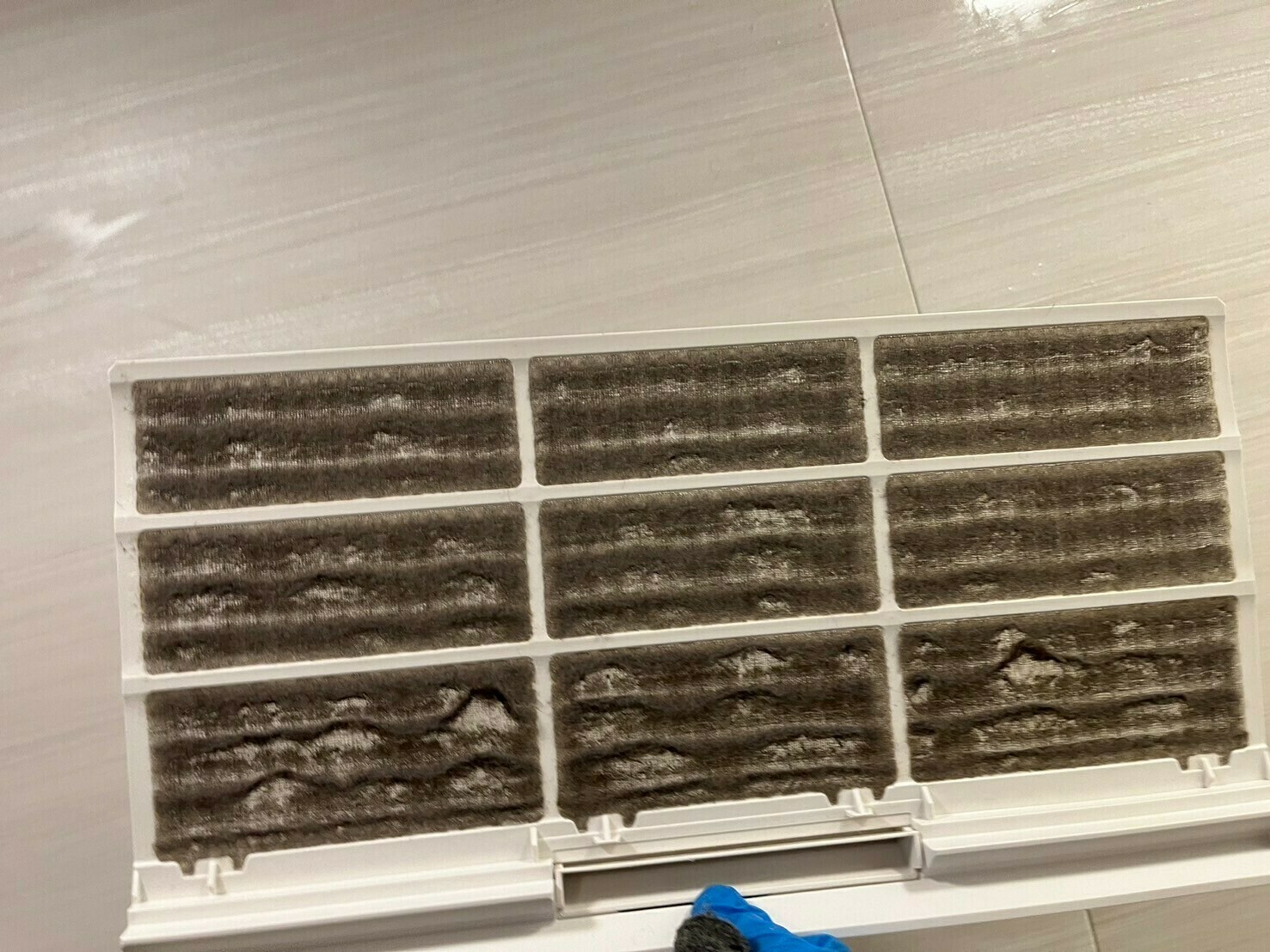 浴槽の換気扇には溜まった埃に黒カビが発生していますね💦