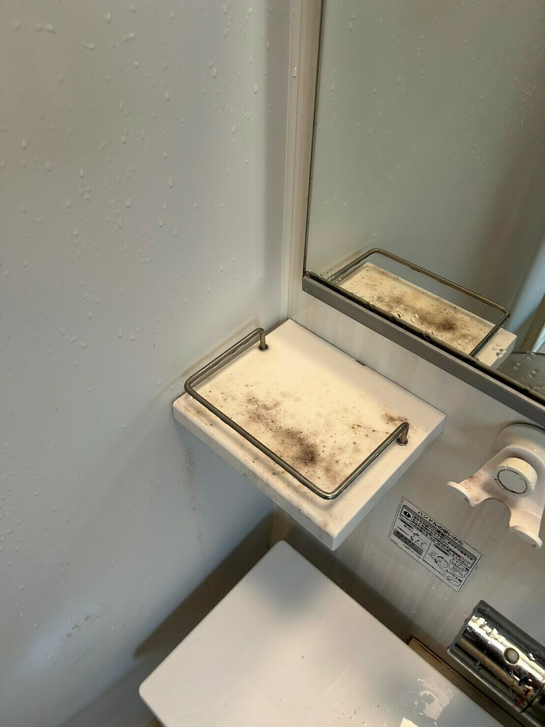 シャンプーなどの小物類を置いていたり、水が流れていきにくく、黒カビが発生してしまいます😣