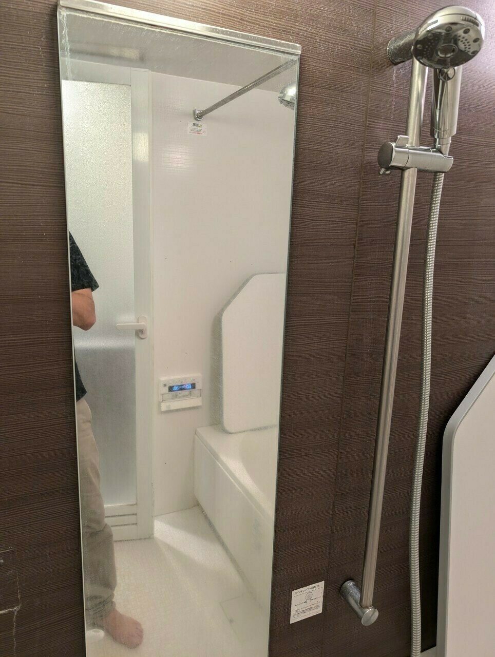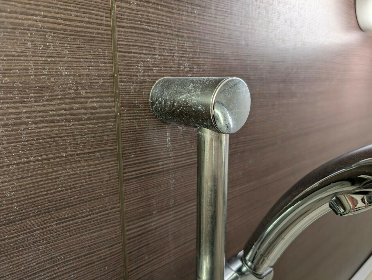 シャワーヘッドを掛ける部分と壁紙には、白いカルキ汚れがついていますね💦