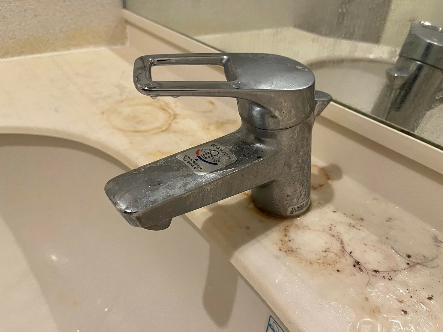 カビがとても繁殖していたりするわけではないですが、 洗面ボウルの黒ずみや蛇口の水垢などはとても目立ちますね。