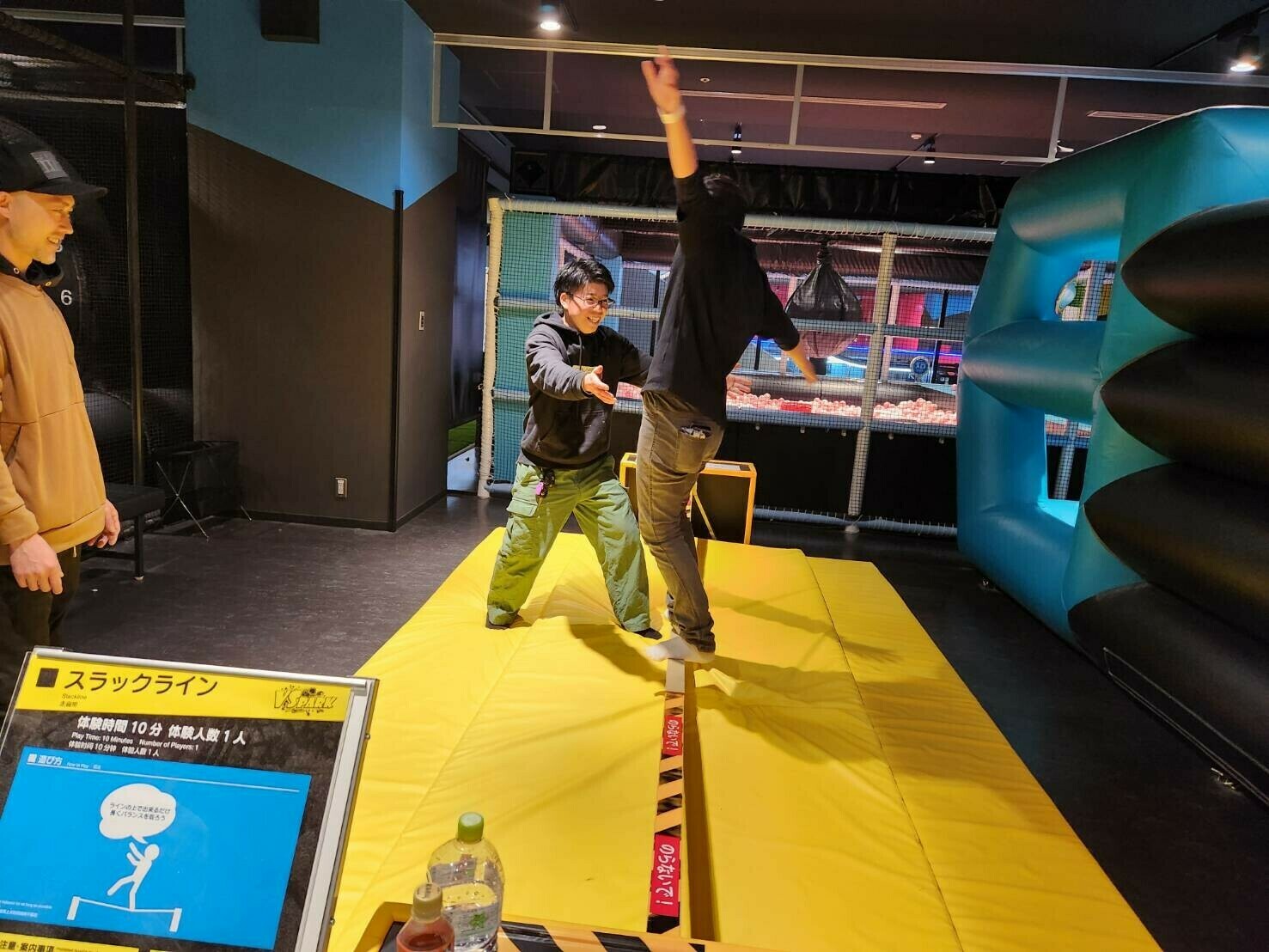 よくアスリートが体幹を鍛える為にやっているスラックラインをスタッフが実際にやってみました😊