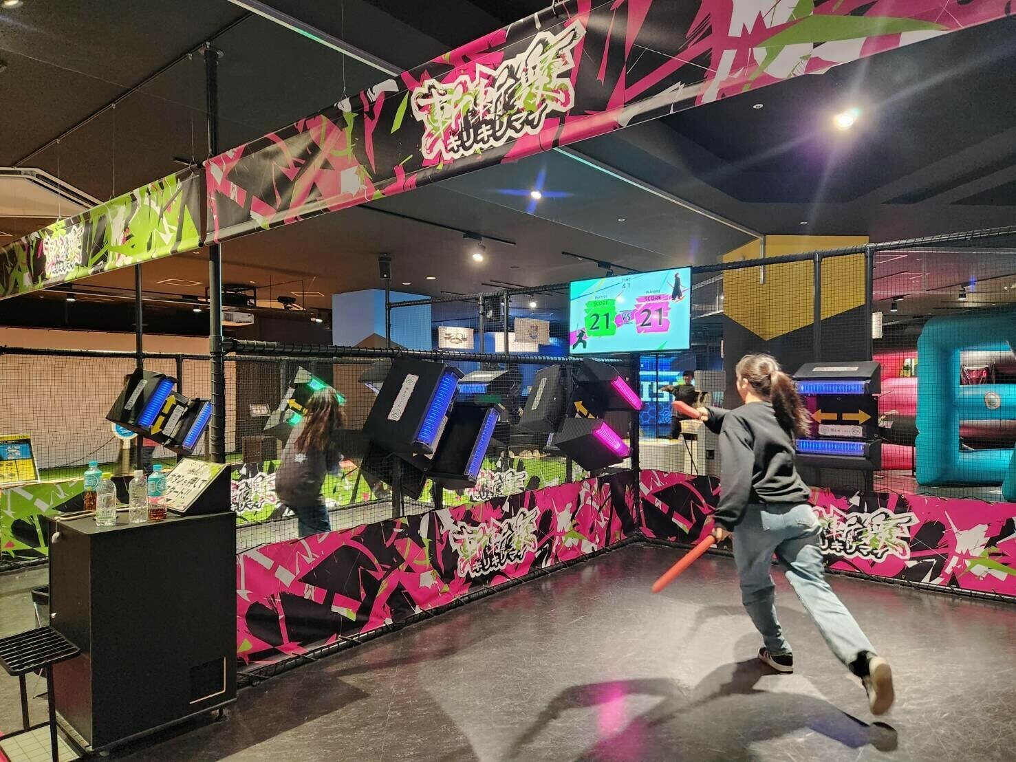 剣のようなスティックを持って、写真のように光る箇所の間を切って得点をとっていくゲームです!