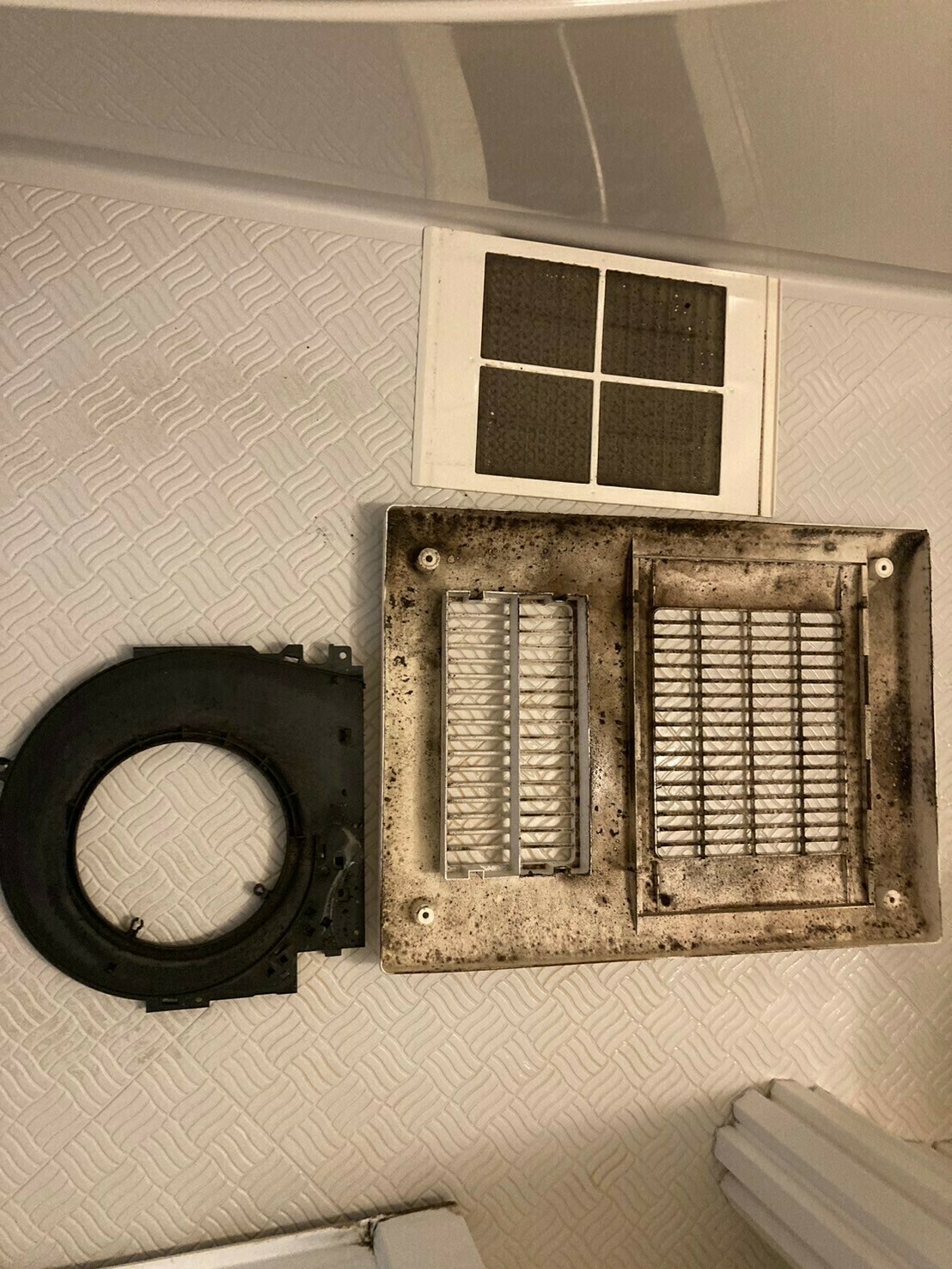 換気扇のカバーの内側には、想像以上に黒カビ汚れがついていますね😱