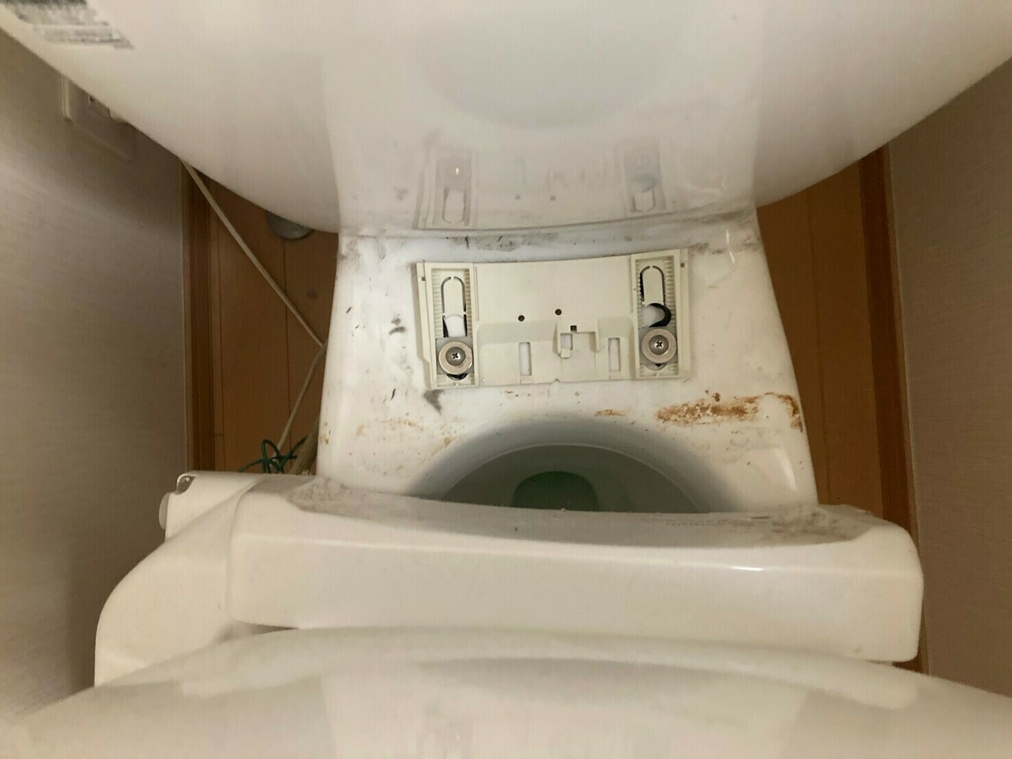 トイレの便座をずらすと、写真のように尿石汚れと埃がたくさん詰まっています😱