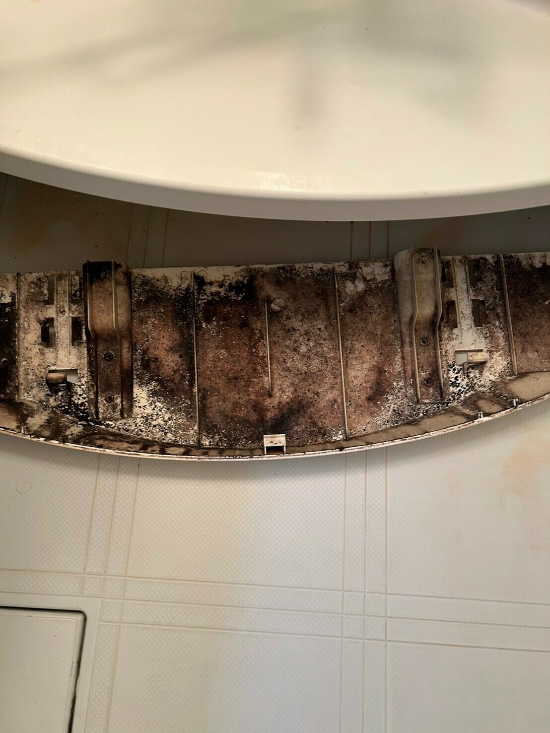 見えないところではありますが、カウンターから流れた石鹼カスや汚れが蓄積され黒カビが発生し、黒カビが溜まってくると床に流れてくるようになります💦