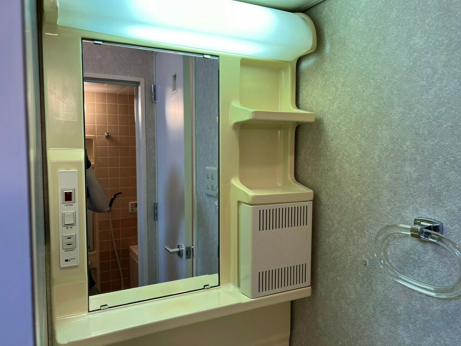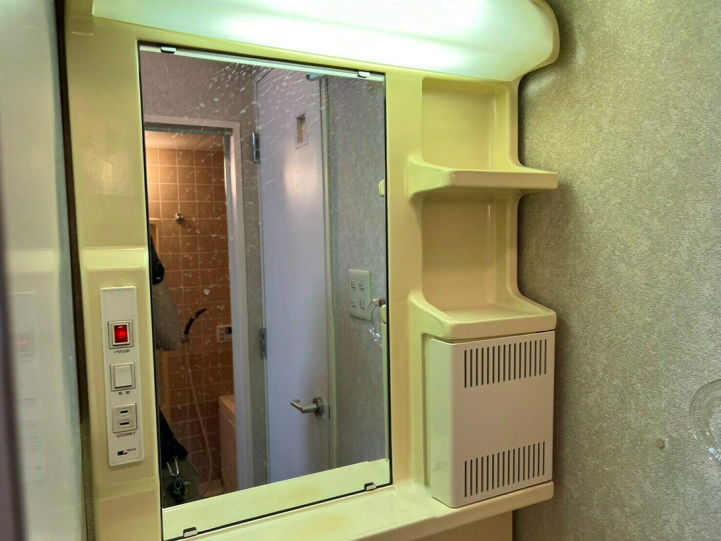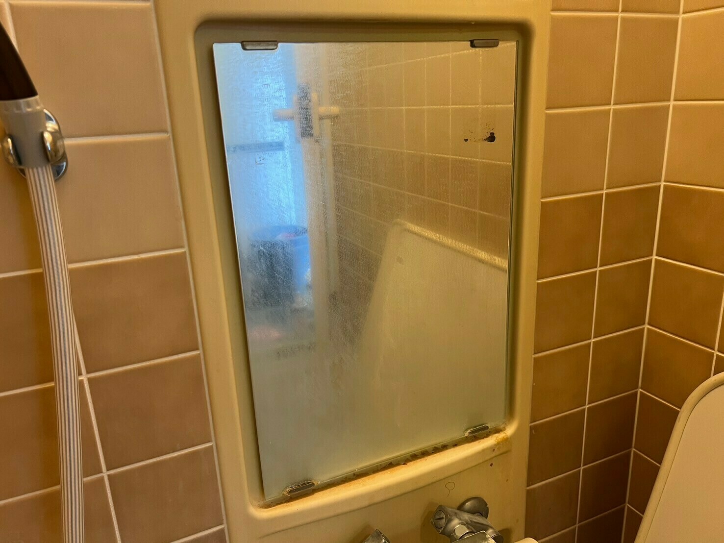 鏡にはウロコ汚れとカルキ汚れで埋め尽くされていますね😵💫