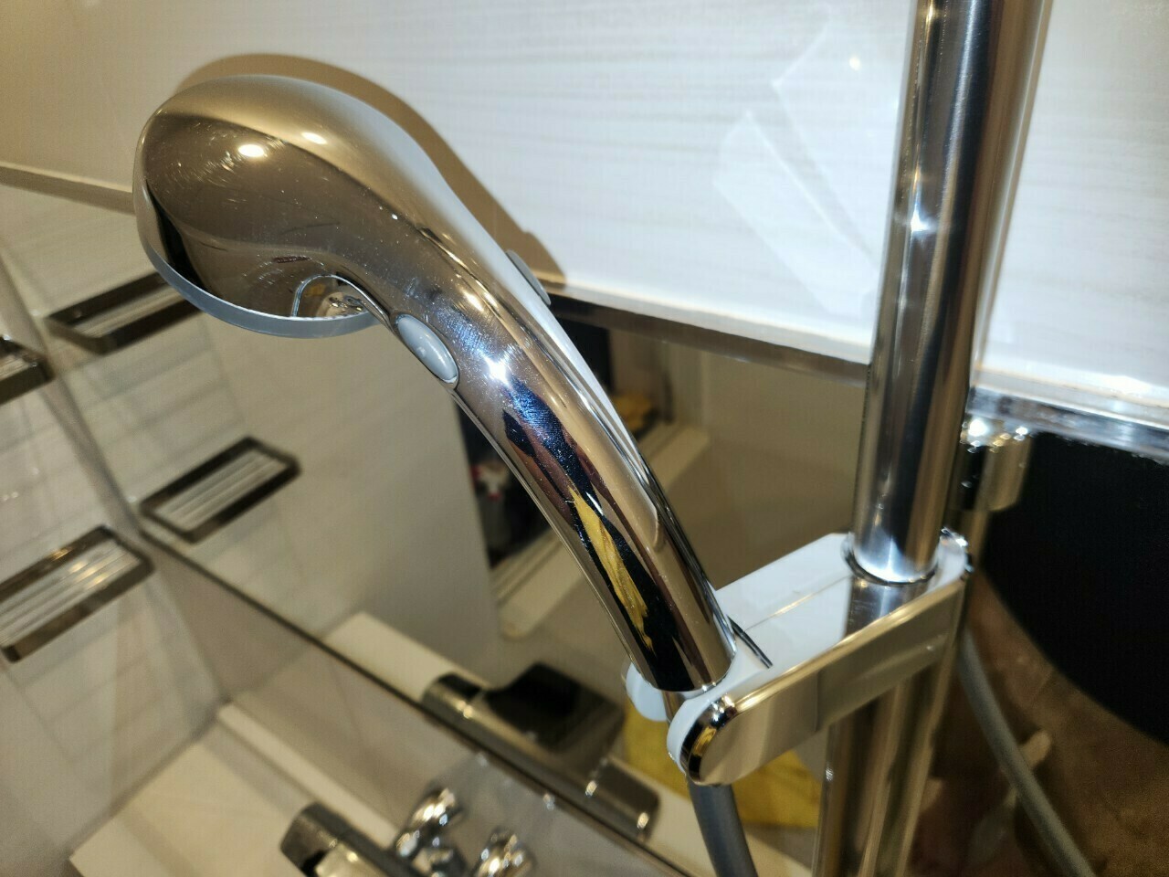 サムネイル画像にもあったこちらの浴室の鏡とシャワーヘッドにはウロコ汚れが目立ちます😵