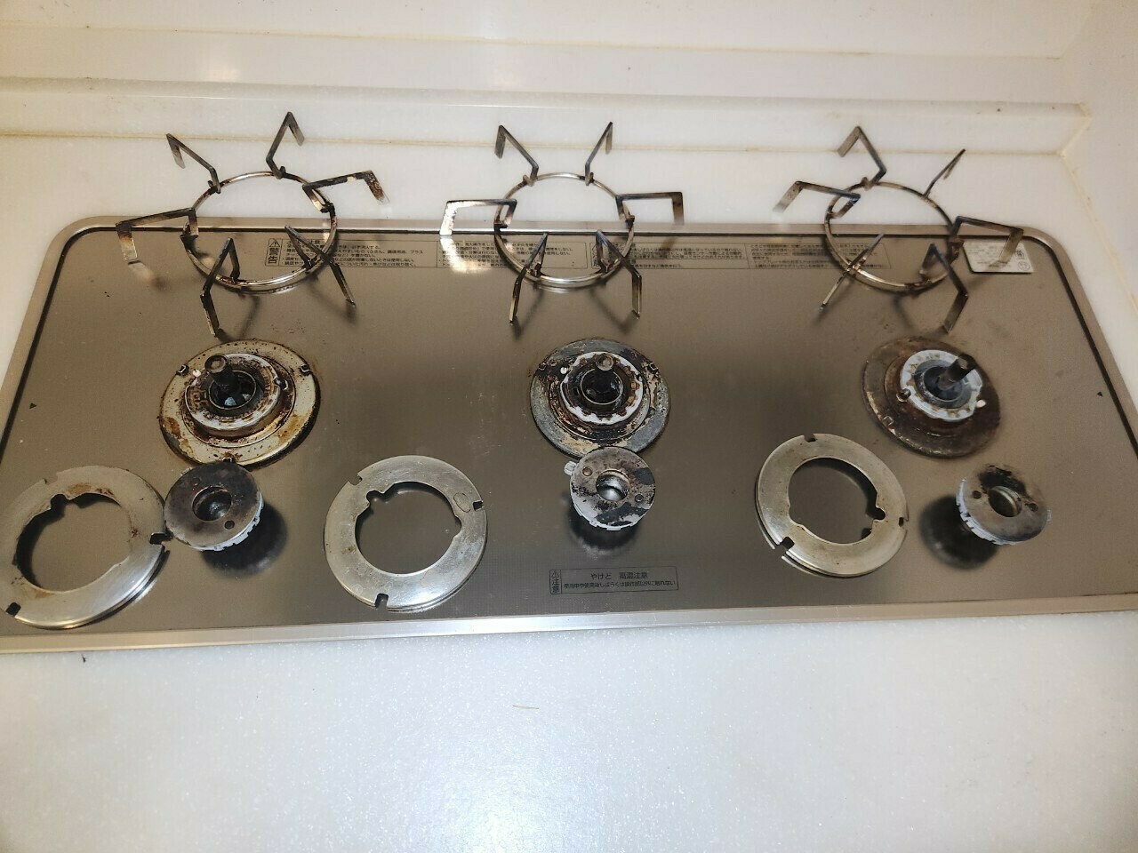 全体的に焦げ汚れは目立っていますが、五徳・バーナーリングには焦げが多くついています…😵💫