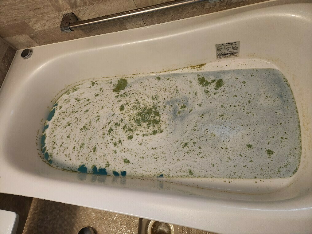 お湯の上に浮いている白い部分は、皮脂汚れや入浴剤が風呂釜配管に蓄積されていた汚れが浮いているのです😨