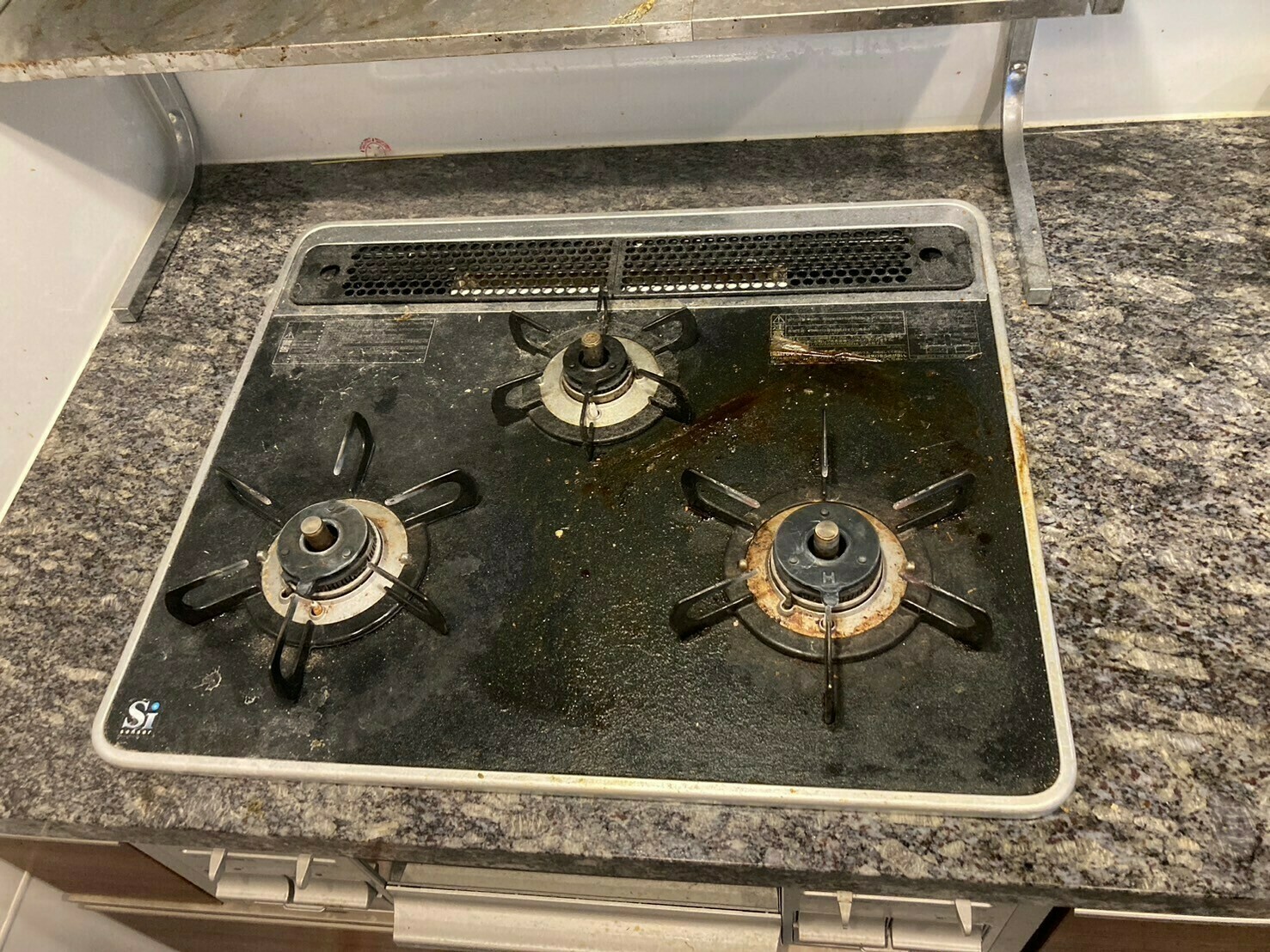 ガスコンロ板には油汚れが全体的に広がっていますね😱