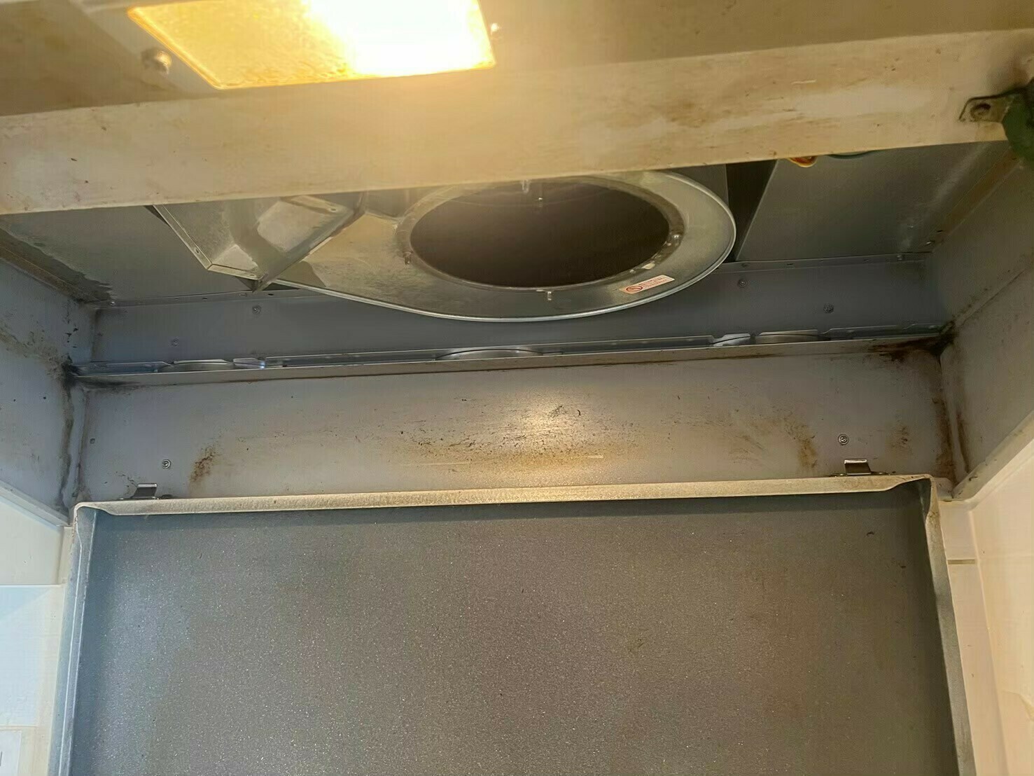 レンジフードの整流板を外すと、庫内は油汚れが参加して黒ずんでいますね💦