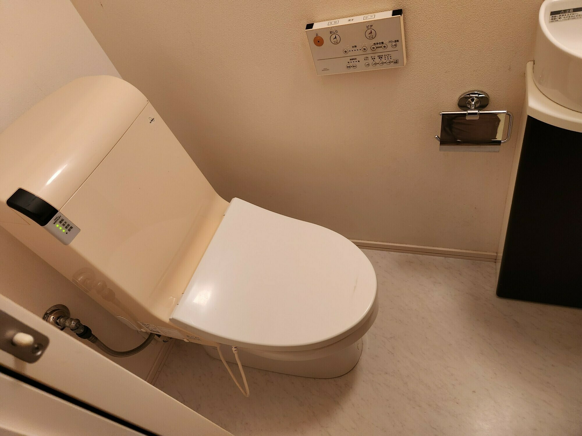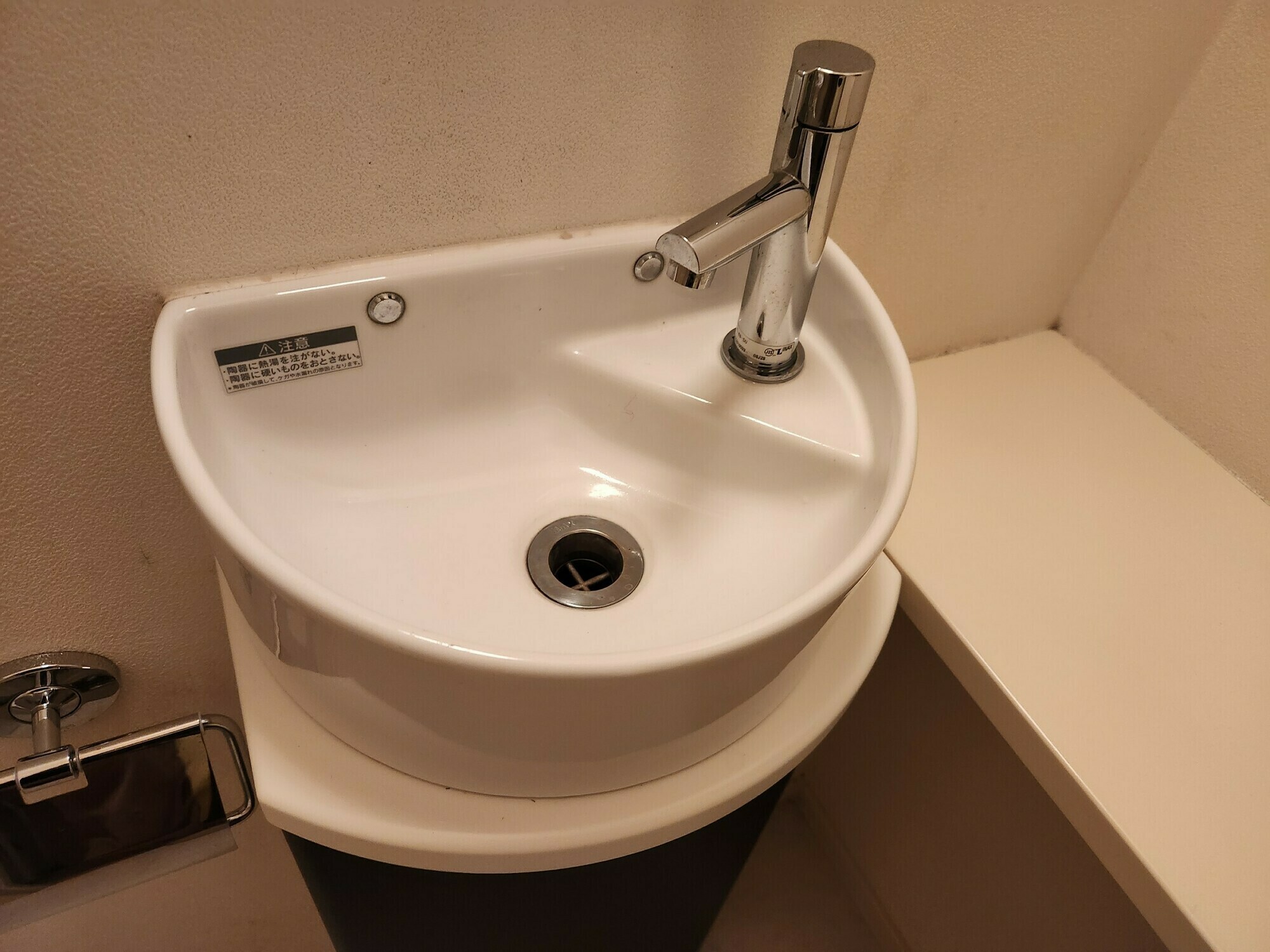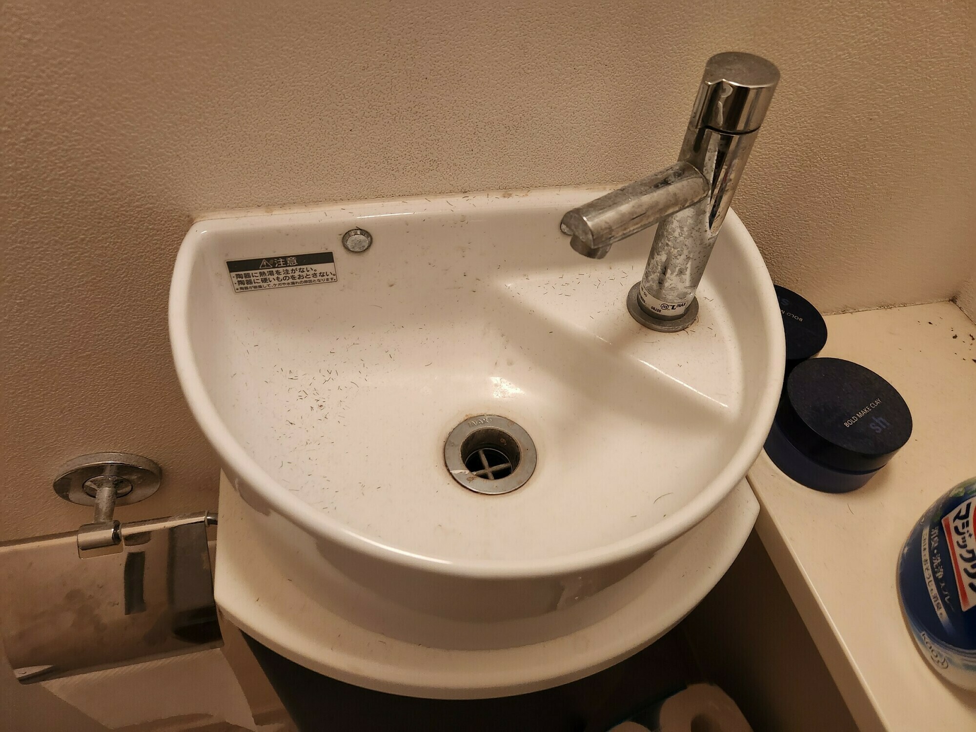 独立洗面台もついているトイレですが、髪の毛や蛇口周りはウロコ汚れで目立っています💦