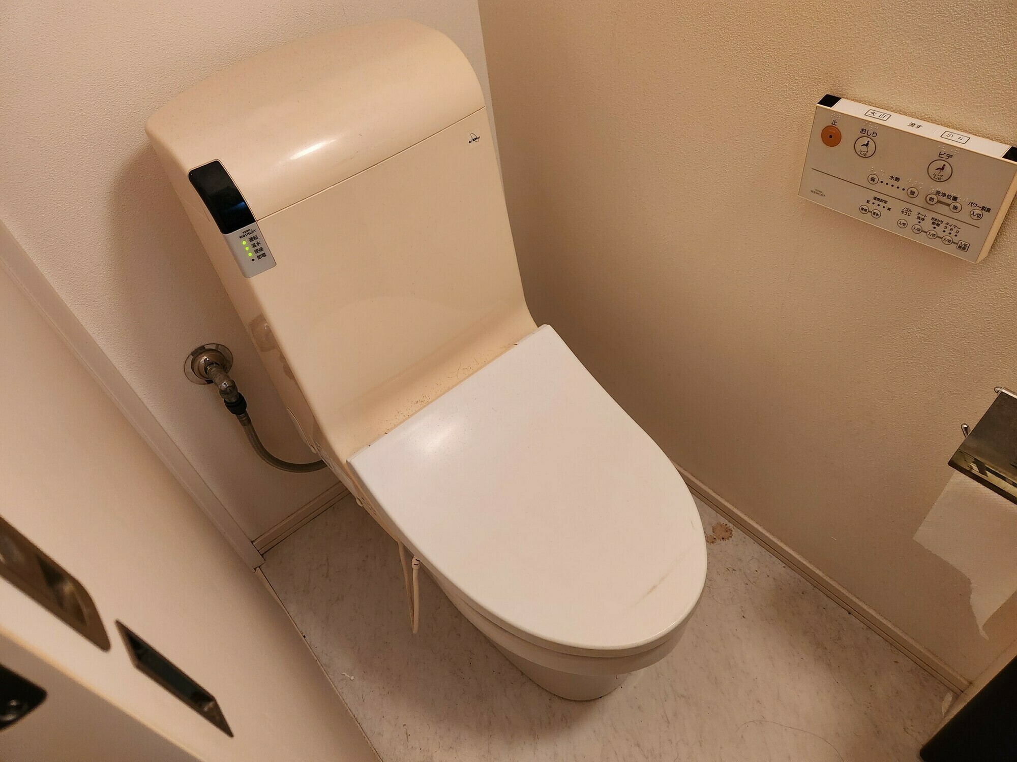 トイレ本体だけでなく、床も埃や髪の毛等汚れが目立っています💦